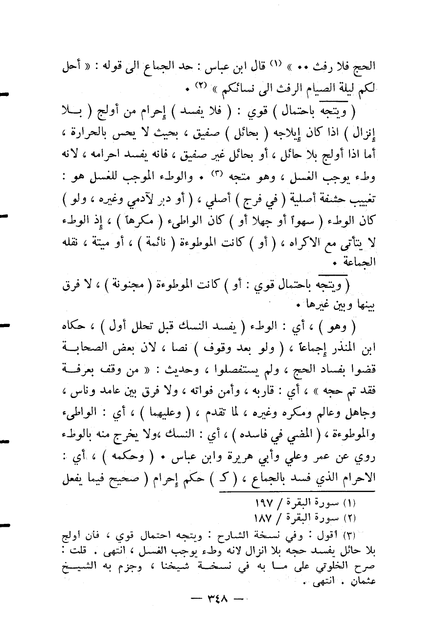 (وَيَتَّجِهُ بِاحْتِمَالٍ) قَوِيٍّ: (فَلَا يَفْسُدُ) إحْرَامُ مَنْ أَوْلَجَ (بِلَا إنْزَالٍ) إذَا كَانَ إيلَاجُهُ (بِحَائِلٍ) صَفِيقٍ، بِحَيْثُ لَا يُحِسُّ بِالْحَرَارَةِ، أَمَّا إذَا أَوْلَجَ بِلَا حَائِلٍ، أَوْ بِحَائِلٍ غَيْرِ صَفِيقٍ، فَإِنَّهُ يَفْسُدُ إحْرَامُهُ؛ لِأَنَّهُ وَطْءٌ يُوجِبُ الْغُسْلَ، وَهُوَ مُتَّجِهٌ.