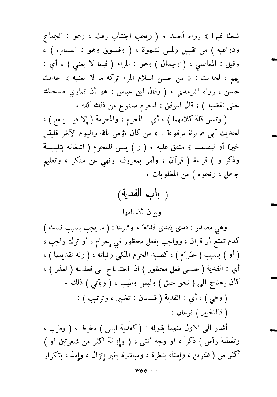 (بَابُ الْفِدْيَةِ) وَبَيَانُ أَقْسَامِهَا وَهِيَ مَصْدَرُ: فَدَى يَفْدِي فِدَاءً. وَشَرْعًا: (مَا يَجِبُ بِسَبَبِ نُسُكٍ) كَدَمِ تَمَتُّعٍ أَوْ قِرَانٍ، وَوَاجِبٌ بِفِعْلٍ مَحْظُورٍ فِي إحْرَامٍ، أَوْ تَرْكِ وَاجِبٍ، (أَوْ) بِسَبَبٍ (حَرُمَ) ، كَصَيْدِ الْحَرَمِ الْمَكِّيِّ وَنَبَاتِهِ، (وَلَهُ تَقْدِيمُهَا) ، أَيْ: الْفِدْيَةُ (عَلَى فِعْلٍ مَحْظُورٍ) إذَا احْتَاجَ إلَى فِعْلِهِ (لِعُذْرٍ) ، كَأَنْ يَحْتَاجُ إلَى (نَحْوِ حَلْقٍ) وَلُبْسٍ وَطِيبٍ، (وَيَأْتِي) ذَلِكَ.