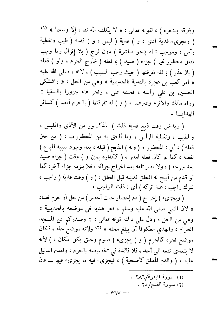 وَيُفَرِّقُهُ بِمَنْحَرِهِ) ، لِقَوْلِهِ تَعَالَى: {لا يُكَلِّفُ اللَّهُ نَفْسًا إِلا وُسْعَهَا} [البقرة: 286] (وَتُجْزِئُ فِدْيَةُ أَذًى، وَ) فِدْيَةُ (لُبْسٍ، وَ) فِدْيَةُ (طِيبٍ وَتَغْطِيَةِ رَأْسٍ، وَمُوجِبِ شَاةٍ بِنَحْوِ مُبَاشَرَةٍ) دُونَ فَرْجٍ (بِلَا إنْزَالٍ وَمَا وَجَبَ بِفِعْلِ مَحْظُورٍ غَيْرِ) جَزَاءِ (صَيْدٍ) ؛ فِعْلُهُ (خَارِجَ؛ الْحَرَمِ، وَلَوْ) فَعَلَهُ (بِلَا عُذْرٍ) ؛ فَلَهُ تَفْرِقَتُهَا (حَيْثُ وَجَبَ السَّبَبُ) ، لِأَنَّهُ، «- صَلَّى اللَّهُ عَلَيْهِ وَسَلَّمَ - أَمَرَ كَعْبَ بْنَ عُجْرَةَ بِالْفِدْيَةِ بِالْحُدَيْبِيَةِ» وَهِيَ مِنْ الْحِلِّ، وَاشْتَكَى الْحُسَيْنُ بْنُ عَلِيٍّ رَأْسَهُ، فَحَلَقَهُ عَلِيٌّ، وَنَحَرَ عَنْهُ جَزُورًا بِالسُّقْيَا " رَوَاهُ مَالِكٌ وَالْأَثْرَمُ وَغَيْرُهُمَا (وَ) لَهُ تَفْرِقَتُهَا (بِالْحَرَمِ أَيْضًا) كَسَائِرِ الْهَدَايَا.