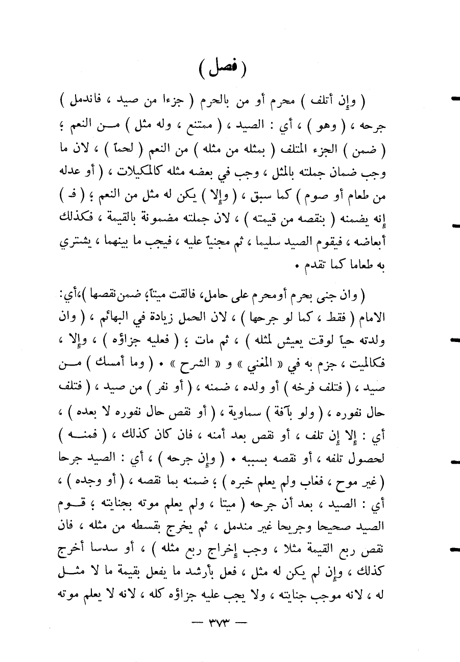 (فَصْلٌ) (وَإِنْ أَتْلَفَ) مُحْرِمٌ أَوْ مَنْ بِالْحَرَمِ (جَزَاءً مِنْ صَيْدٍ، فَانْدَمَلَ) جُرْحُهُ، (وَهُوَ) ، أَيْ: الصَّيْدُ، (مُمْتَنِعٌ، وَلَهُ مِثْلٌ) مِنْ النَّعَمِ؛ (ضُمِنَ) الْجُزْءُ الْمُتْلَفُ (بِمِثْلِهِ مِنْ مِثْلِهِ) مِنْ النَّعَمِ (لَحْمًا) ، لِأَنَّ مَا وَجَبَ ضَمَانُ جُمْلَتِهِ بِالْمِثْلِ، وَجَبَ فِي بَعْضِهِ مِثْلُهُ كَالْمَكِيلَاتِ، (أَوْ عَدْلُهُ مِنْ طَعَامٍ أَوْ صَوْمٍ) كَمَا سَبَقَ، (وَإِلَّا) يَكُنْ لَهُ مِثْلٌ مِنْ النَّعَمِ؛ (فَ) إنَّهُ يَضْمَنُهُ (بِنَقْصِهِ مِنْ قِيمَتِهِ) ، لِأَنَّ جُمْلَتَهُ مَضْمُونَةٌ بِالْقِيمَةِ، فَكَذَلِكَ أَبْعَاضُهُ، فَيُقَوَّمُ الصَّيْدُ سَلِيمًا، ثُمَّ مَجْنِيًّا عَلَيْهِ، فَيَجِبُ مَا بَيْنَهُمَا، يَشْتَرِي بِهِ طَعَامًا كَمَا تَقَدَّمَ.