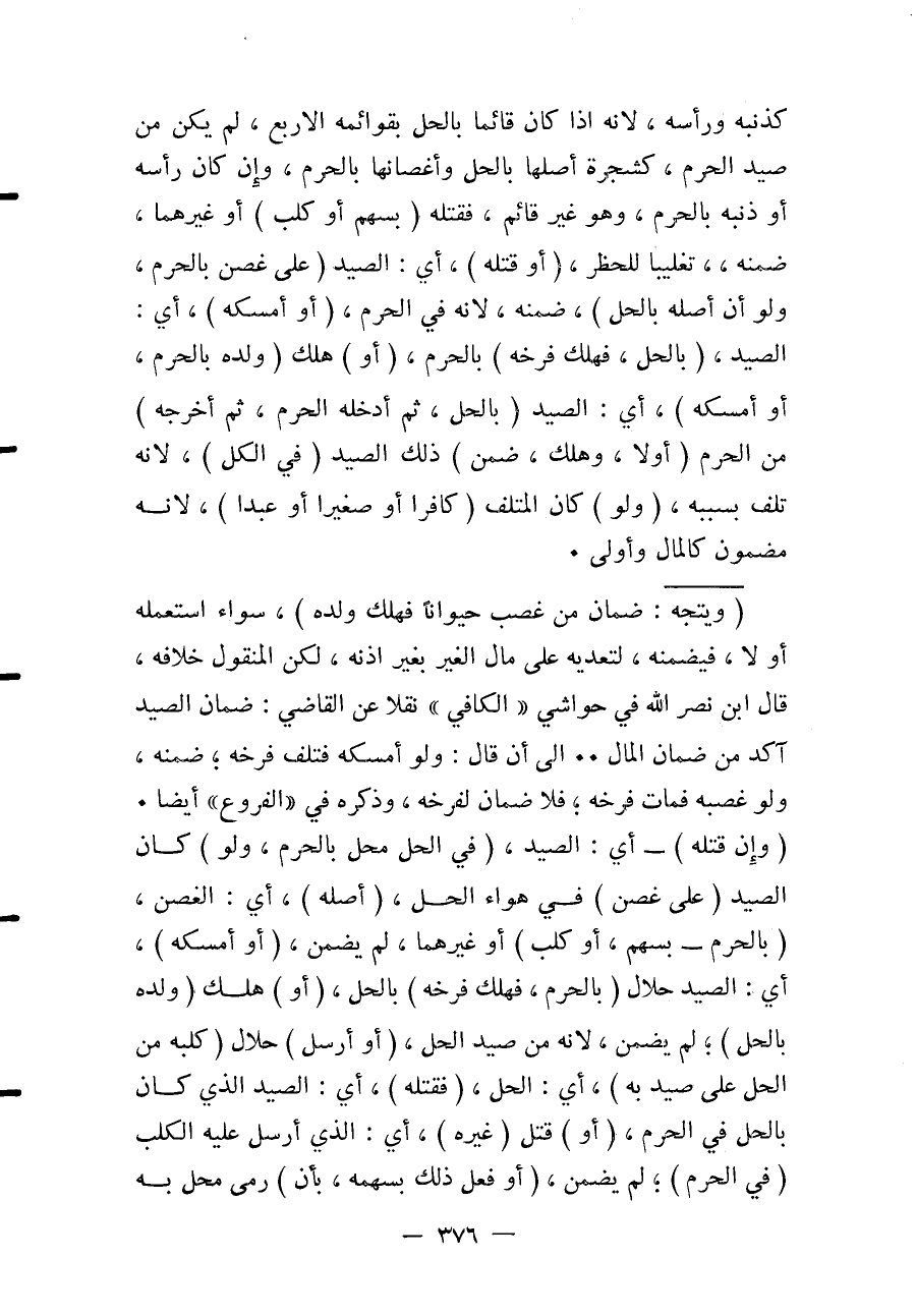 كَذَنَبِهِ وَرَأْسِهِ، لِأَنَّهُ إذَا كَانَ قَائِمًا بِالْحِلِّ بِقَوَائِمِهِ الْأَرْبَعِ، لَمْ يَكُنْ مِنْ صَيْدِ الْحَرَمِ، كَشَجَرَةٍ أَصْلُهَا بِالْحِلِّ وَأَغْصَانُهَا بِالْحَرَمِ، وَإِنْ كَانَ رَأْسُهُ أَوْ ذَنَبُهُ بِالْحَرَمِ، وَهُوَ غَيْرُ قَائِمٍ، فَقَتَلَهُ (بِسَهْمٍ أَوْ كَلْبٍ) أَوْ غَيْرِهِمَا، ضَمِنَهُ، تَغْلِيبًا لِلْحَظْرِ.