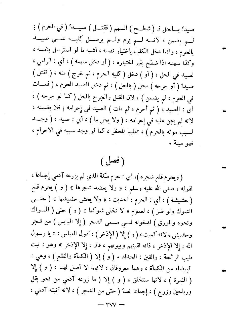 (فَصْلٌ) (وَيَحْرُمُ قَلْعُ شَجَرِهِ) ، أَيْ: حَرَمِ مَكَّةَ الَّذِي لَمْ يَزْرَعْهُ آدَمِيٌّ إجْمَاعًا، لِقَوْلِهِ، «- صَلَّى اللَّهُ عَلَيْهِ وَسَلَّمَ - وَلَا يُعْضَدُ شَجَرُهَا» (وَ) يَحْرُمُ قَلْعُ (حَشِيشِهِ) ، أَيْ: الْحَرَمِ، لِحَدِيثِ: «وَلَا يُحَشُّ حَشِيشُهَا» (حَتَّى الشَّوْكُ وَلَوْ ضَرَّ) ، لِعُمُومِ " لَا تُخْلَى شَوْكُهَا " (وَ) حَتَّى (الْمِسْوَاكُ وَنَحْوُهُ وَالْوَرَقُ) لِدُخُولِهِ فِي مُسَمَّى الشَّجَرِ (إلَّا الْيَابِسَ) مِنْ شَجَرٍ وَحَشِيشٍ، لِأَنَّهُ كَمَيِّتٍ، (وَ) إلَّا (الْإِذْخِرَ) ، لِقَوْلِ «الْعَبَّاسِ: يَا رَسُولَ اللَّهِ: إلَّا الْإِذْخِرَ، فَإِنَّهُ لِقَيْنِهِمْ وَبُيُوتِهِمْ، قَالَ: إلَّا الْإِذْخِرَ» ، وَهُوَ: نَبْتٌ طَيِّبُ الرَّائِحَةِ، وَالْقَيْنُ: الْحَدَّادُ.
