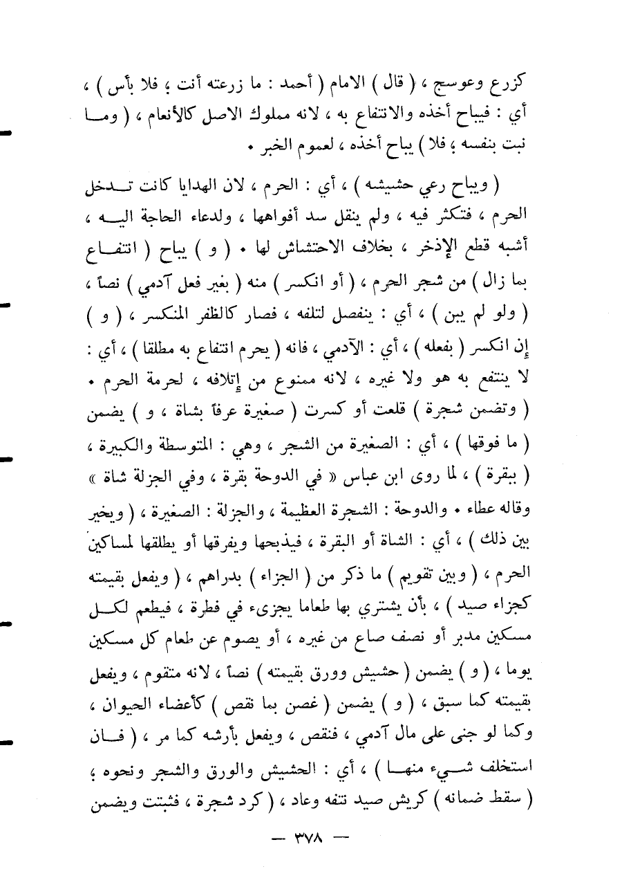كَزَرْعٍ وَعَوْسَجٍ، (قَالَ) الْإِمَامُ (أَحْمَدُ: مَا زَرَعْته أَنْتَ؛ فَلَا بَأْسَ) ، أَيْ: فَيُبَاحُ أَخْذُهُ وَالِانْتِفَاعُ بِهِ، لِأَنَّهُ مَمْلُوكُ الْأَصْلِ كَالْأَنْعَامِ، (وَمَا نَبَتَ بِنَفْسِهِ؛ فَلَا) يُبَاحُ أَخْذُهُ، لِعُمُومِ الْخَبَرِ.