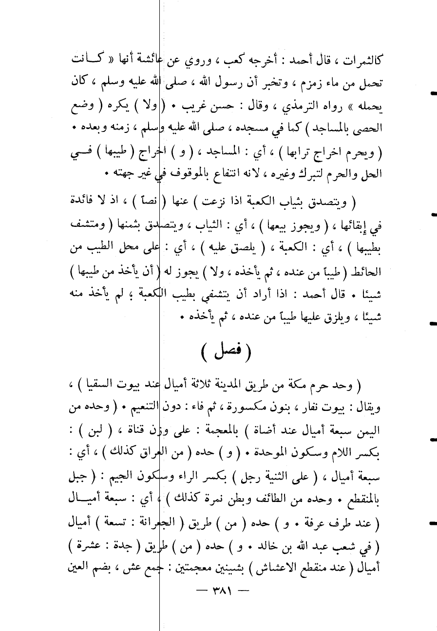 (فَصْلٌ) (وَحَدُّ حَرَمِ مَكَّةَ مِنْ طَرِيقِ الْمَدِينَةِ ثَلَاثَةُ أَمْيَالٍ عِنْدَ بُيُوتِ السُّقْيَا) ، وَيُقَالُ: بُيُوتُ نِفَارٍ، بِنُونٍ مَكْسُورَةٍ، ثُمَّ فَاءٌ: دُونَ التَّنْعِيمِ.