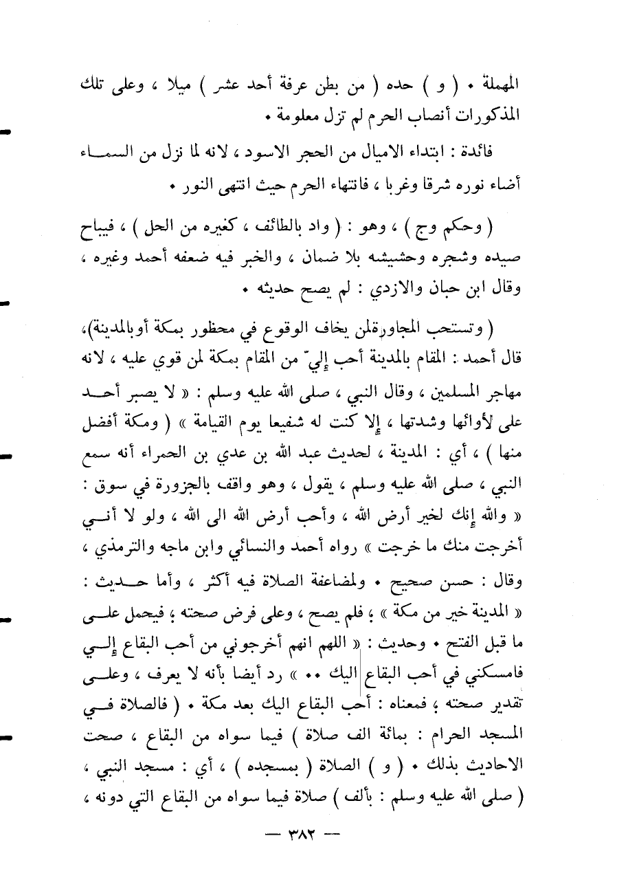 (وَ) حَدُّهُ (مِنْ بَطْنِ عَرَفَةَ أَحَدَ عَشَرَ) مِيلًا، وَعَلَى تِلْكَ الْمَذْكُورَاتِ أَنْصَابُ الْحَرَمِ لَمْ تَزَلْ مَعْلُومَةً.