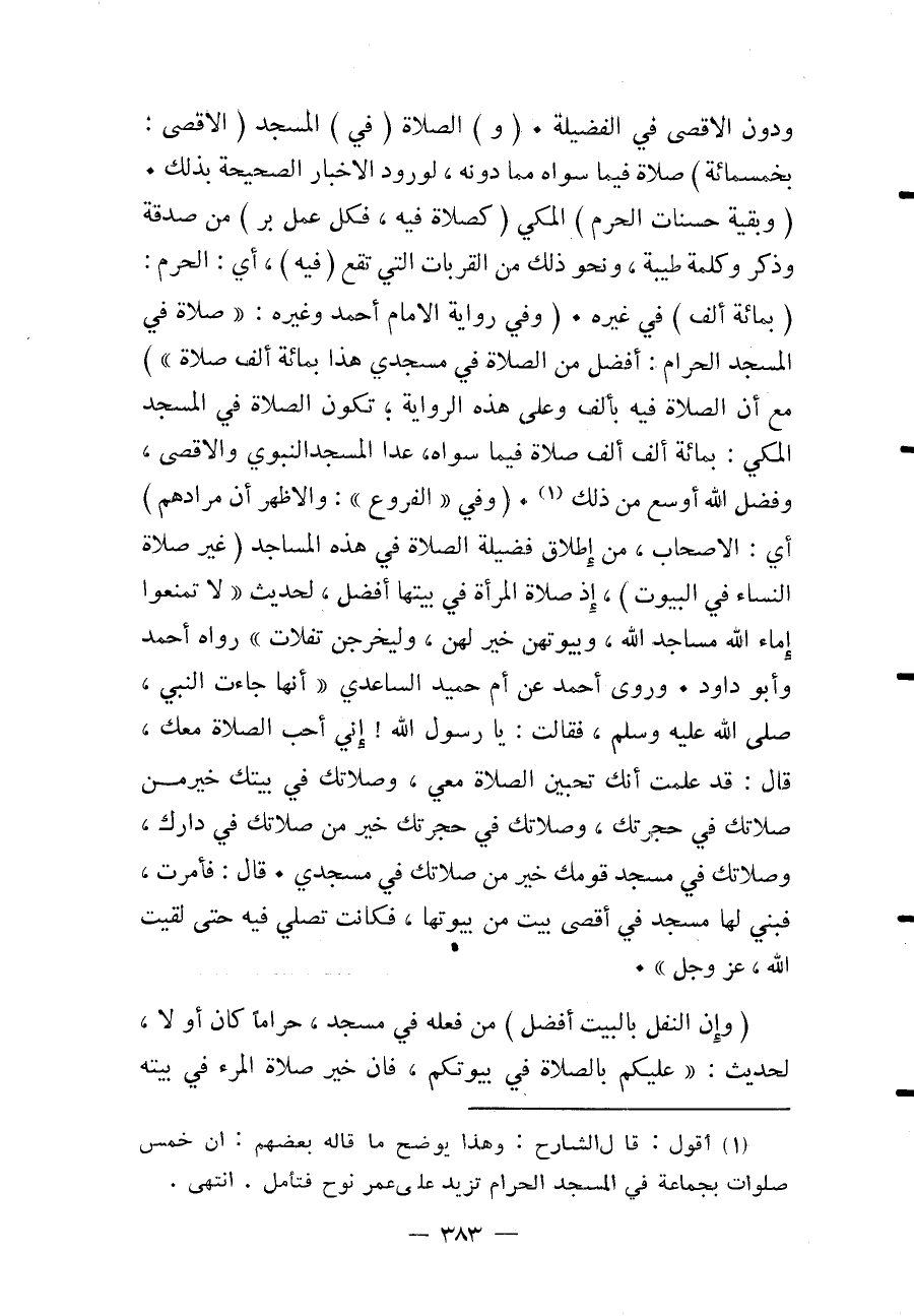 (وَفِي " الْفُرُوعِ ": وَالْأَظْهَرُ أَنَّ مُرَادَهُمْ) أَيْ: الْأَصْحَابِ، مِنْ إطْلَاقِ فَضِيلَةِ الصَّلَاةِ فِي هَذِهِ الْمَسَاجِدِ (غَيْرُ صَلَاةِ النِّسَاءِ فِي الْبُيُوتِ) ، إذْ صَلَاةُ الْمَرْأَةِ فِي بَيْتِهَا أَفْضَلُ، لِحَدِيثِ «لَا تَمْنَعُوا إمَاءَ اللَّهِ مَسَاجِدَ اللَّهِ، وَبُيُوتُهُنَّ خَيْرٌ لَهُنَّ، وَلْيَخْرُجْنَ تَفِلَاتٍ» رَوَاهُ أَحْمَدُ وَأَبُو دَاوُد.
