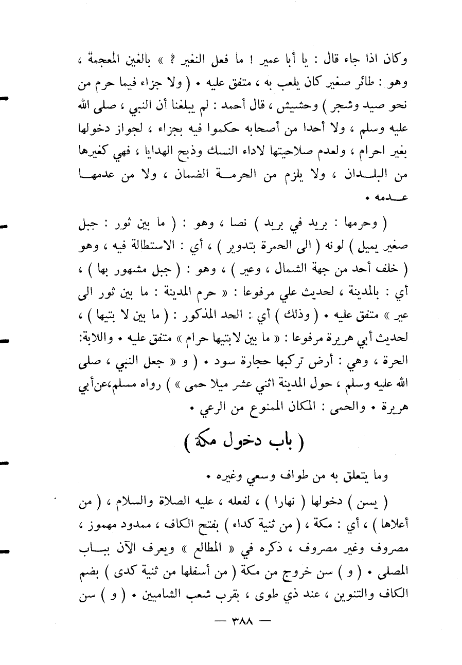 (يُسَنُّ) دُخُولُهَا (نَهَارًا) ، لِفِعْلِهِ - عَلَيْهِ الصَّلَاةُ وَالسَّلَامُ -، (مِنْ أَعْلَاهَا) ، أَيْ: مَكَّةَ، (مِنْ ثَنِيَّةِ كَدَاءٍ) بِفَتْحِ الْكَافِ، مَمْدُودٌ مَهْمُوزٌ، مَصْرُوفٌ وَغَيْرُ مَصْرُوفٍ، ذَكَرَهُ فِي " الْمَطَالِعِ " وَيُعْرَفُ الْآنَ بِبَابِ الْمُصَلَّى.