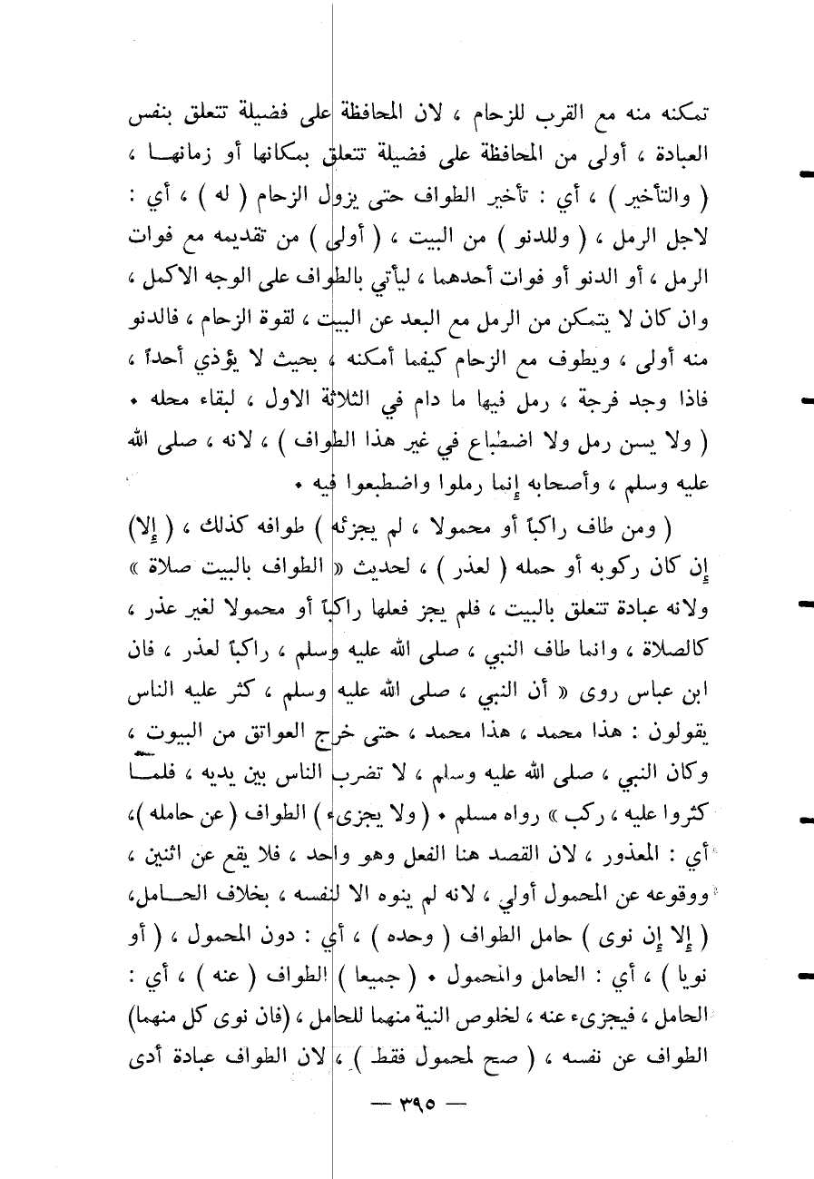تَمَكُّنِهِ مِنْهُ مَعَ الْقُرْبِ لِلزِّحَامِ، لِأَنَّ الْمُحَافَظَةَ عَلَى فَضِيلَةٍ تَتَعَلَّقُ بِنَفْسِ الْعِبَادَةِ، أَوْلَى مِنْ الْمُحَافَظَةِ عَلَى فَضِيلَةٍ تَتَعَلَّقُ بِمَكَانِهَا أَوْ زَمَانِهَا، (وَالتَّأْخِيرُ) ، أَيْ: تَأْخِيرُ الطَّوَافِ حَتَّى يَزُولَ الزِّحَامُ (لَهُ) ، أَيْ: لِأَجْلِ الرَّمَلِ، (وَلِلدُّنُوِّ) مِنْ الْبَيْتِ، (أَوْلَى) مِنْ تَقْدِيمِهِ مَعَ فَوَاتِ الرَّمَلِ، أَوْ الدُّنُوِّ أَوْ فَوَاتِ أَحَدِهِمَا، لِيَأْتِيَ بِالطَّوَافِ عَلَى الْوَجْهِ الْأَكْمَلِ، وَإِنْ كَانَ لَا يَتَمَكَّنُ مِنْ الرَّمَلِ مَعَ الْبُعْدِ عَنْ الْبَيْتِ، لِقُوَّةِ الزِّحَامِ، فَالدُّنُوُّ مِنْهُ أَوْلَى، وَيَطُوفُ مَعَ الزِّحَامِ كَيْفَمَا أَمْكَنَهُ، بِحَيْثُ لَا يُؤْذِي أَحَدًا، فَإِذَا وَجَدَ فُرْجَةً، رَمَلَ فِيهَا مَا دَامَ فِي الثَّلَاثَةِ الْأُوَلِ؛ لِبَقَاءِ مَحَلِّهِ.