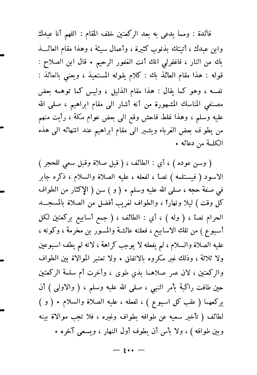 فَائِدَةٌ: وَمِمَّا يُدْعَى بِهِ بَعْدَ الرَّكْعَتَيْنِ خَلْفَ الْمَقَامِ: «اللَّهُمَّ أَنَا عَبْدُك وَابْنُ عَبْدِك، أَتَيْتُك بِذُنُوبٍ كَثِيرَةٍ، وَأَعْمَالٍ سَيِّئَةٍ، وَهَذَا مَقَامُ الْعَائِذِ بِكَ مِنْ النَّارِ، فَاغْفِرْ لِي إنَّكَ أَنْتَ الْغَفُورُ الرَّحِيمُ»