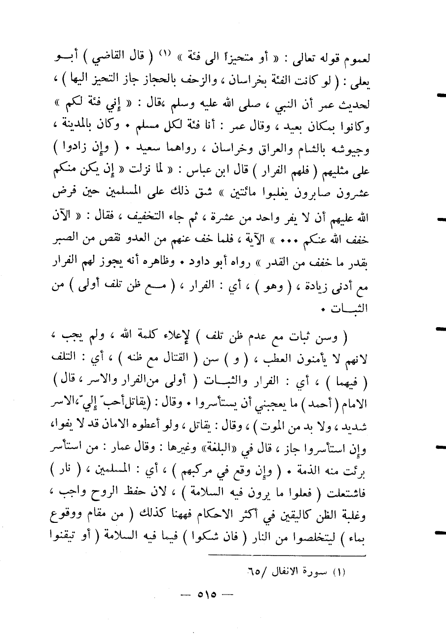 لِعُمُومِ قَوْله تَعَالَى: {أَوْ مُتَحَيِّزًا إِلَى فِئَةٍ} [الأنفال: 16] (قَالَ الْقَاضِي) أَبُو يَعْلَى: (لَوْ كَانَتْ الْفِئَةُ بِخُرَاسَانَ، وَالزَّحْفُ بِالْحِجَازِ جَازَ التَّحَيُّزُ إلَيْهَا) ، لِحَدِيثِ عُمَرَ أَنَّ النَّبِيَّ - صَلَّى اللَّهُ عَلَيْهِ وَسَلَّمَ - قَالَ: «إنِّي فِئَةٌ لَكُمْ» وَكَانُوا بِمَكَانٍ بَعِيدٍ، وَقَالَ عُمَرُ: أَنَا فِئَةٌ لِكُلِّ مُسْلِمٍ. وَكَانَ بِالْمَدِينَةِ، وَجُيُوشُهُ بِالشَّامِ وَالْعِرَاقِ وَخُرَاسَانَ، رَوَاهُمَا سَعِيدٌ. (وَإِنْ زَادُوا) عَلَى مِثْلَيْهِمْ (فَلَهُمْ الْفِرَارُ) قَالَ ابْنُ عَبَّاسٍ: " لَمَّا نَزَلَتْ {إِنْ يَكُنْ مِنْكُمْ عِشْرُونَ صَابِرُونَ يَغْلِبُوا مِائَتَيْنِ} [الأنفال: 65] شَقَّ ذَلِكَ عَلَى الْمُسْلِمِينَ حِينَ فَرَضَ اللَّهُ عَلَيْهِمْ أَنْ لَا يَفِرَّ وَاحِدٌ مِنْ عَشْرَةٍ، ثُمَّ جَاءَ التَّخْفِيفُ، فَقَالَ: {الآنَ خَفَّفَ اللَّهُ عَنْكُمْ} [الأنفال: 66] الْآيَةُ، فَلَمَّا خَفَّفَ عَنْهُمْ مِنْ الْعَدُوِّ نَقَصَ مِنْ الصَّبْرِ بِقَدْرِ مَا خَفَّفَ مِنْ الْقَدْرِ " رَوَاهُ أَبُو دَاوُد وَظَاهِرُهُ أَنَّهُ يَجُوزُ لَهُمْ الْفِرَارُ مَعَ أَدْنَى زِيَادَةٍ، (وَهُوَ) ، أَيْ: الْفِرَارُ، (مَعَ ظَنِّ تَلَفٍ أَوْلَى) مِنْ الثَّبَاتِ.