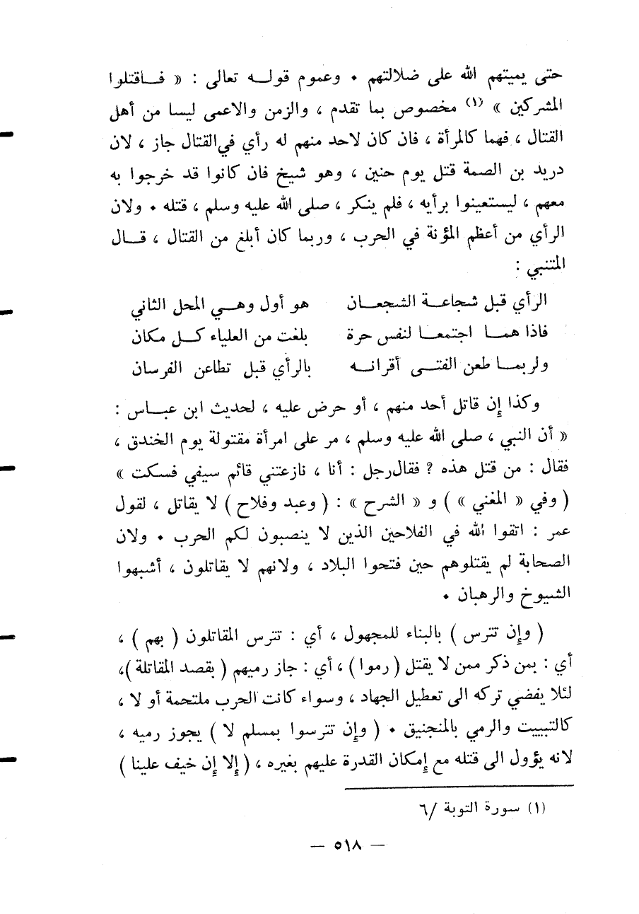 حَتَّى يُمِيتَهُمْ اللَّهُ عَلَى ضَلَالَتِهِمْ وَعُمُومُ قَوْله تَعَالَى: {فَاقْتُلُوا الْمُشْرِكِينَ} [التوبة: 5] مَخْصُوصٌ بِمَا تَقَدَّمَ، وَالزَّمِنُ وَالْأَعْمَى لَيْسَا مِنْ أَهْلِ الْقِتَالِ، فَهُمَا كَالْمَرْأَةِ، فَإِنْ كَانَ لِأَحَدٍ مِنْهُمْ لَهُ رَأْيٌ فِي الْقِتَالِ جَازَ، «لِأَنَّ دُرَيْدَ بْنَ الصِّمَّةِ قُتِلَ يَوْمَ حُنَيْنٌ وَهُوَ شَيْخٌ فَانٍ كَانُوا قَدْ خَرَجُوا بِهِ مَعَهُمْ، لِيَسْتَعِينُوا بِرَأْيِهِ، فَلَمْ يُنْكِرْ - صَلَّى اللَّهُ عَلَيْهِ وَسَلَّمَ - قَتْلَهُ.» وَلِأَنَّ الرَّأْيَ مِنْ أَعْظَمِ الْمُؤْنَةِ فِي الْحَرْبِ، وَرُبَّمَا كَانَ أَبْلَغَ مِنْ الْقِتَالِ، قَالَ الْمُتَنَبِّي: