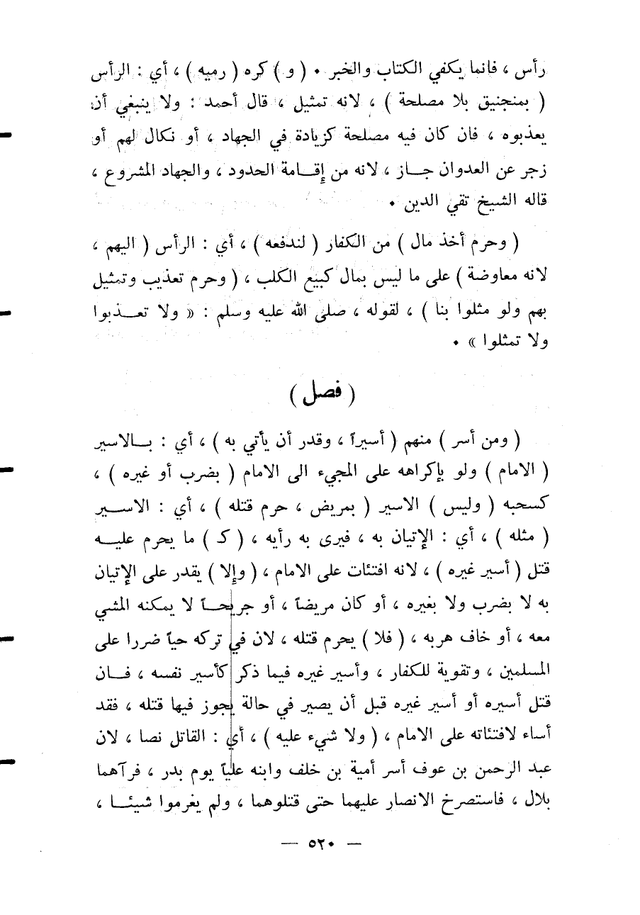 (فَصْلٌ) (وَمَنْ أَسَرَ) مِنْهُمْ (أَسِيرًا، وَقَدَرَ أَنْ يَأْتِيَ بِهِ) ، أَيْ: بِالْأَسِيرِ (الْإِمَامَ) وَلَوْ بِإِكْرَاهِهِ عَلَى الْمَجِيءِ إلَى الْإِمَامِ (بِضَرْبٍ أَوْ غَيْرِهِ) ، كَسَحْبِهِ (وَلَيْسَ) الْأَسِيرُ (بِمَرِيضٍ، حَرُمَ قَتْلُهُ) ، أَيْ: الْأَسِيرِ (مِثْلُهُ) ، أَيْ: الْإِتْيَانُ بِهِ، فَيَرَى بِهِ رَأْيَهُ، (ك) مَا يَحْرُمُ عَلَيْهِ قَتْلُ (أَسِيرِ غَيْرِهِ) ، لِأَنَّهُ افْتِئَاتٌ عَلَى الْإِمَامِ، (وَإِلَّا) يَقْدِرُ عَلَى الْإِتْيَانِ بِهِ لَا بِضَرْبٍ وَلَا بِغَيْرِهِ، أَوْ كَانَ مَرِيضًا، أَوْ جَرِيحًا لَا يُمْكِنُهُ الْمَشْيُ مَعَهُ، أَوْ خَافَ هَرَبَهُ، (فَلَا) يَحْرُمُ قَتْلُهُ، لِأَنَّ فِي تَرْكِهِ حَيًّا ضَرَرًا عَلَى الْمُسْلِمِينَ، وَتَقْوِيَةً لِلْكُفَّارِ، وَأَسِيرُ غَيْرِهِ فِيمَا ذُكِرَ كَأَسِيرِ نَفْسِهِ، فَإِنْ قَتَلَ أَسِيرَهُ أَوْ أَسِيرَ غَيْرِهِ قَبْلَ أَنْ يَصِيرَ فِي حَالَةٍ يَجُوزُ فِيهَا قَتْلُهُ، فَقَدْ أَسَاءَ لِافْتِئَاتِهِ عَلَى الْإِمَامِ، (وَلَا شَيْءَ عَلَيْهِ) ، أَيْ: الْقَاتِلِ نَصًّا، لِأَنَّ عَبْدَ الرَّحْمَنِ بْنَ عَوْفٍ أَسَرَ أُمَيَّةَ بْنَ خَلَفٍ وَابْنَهُ عَلِيًّا يَوْمَ بَدْرٍ، فَرَآهُمَا بِلَالٌ، فَاسْتَصْرَخَ الْأَنْصَارُ عَلَيْهِمَا حَتَّى قَتَلُوهُمَا، وَلَمْ يَغْرَمُوا شَيْئًا،