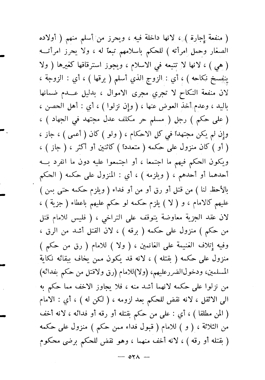 (وَإِنْ نَزَلُوا) ، أَيْ: أَهْلُ الْحِصْنِ، (عَلَى حُكْمِ) رَجُلٍ (مُسْلِمٍ حُرٍّ مُكَلَّفٍ عَدْلٍ مُجْتَهِدٍ فِي الْجِهَادِ) ، وَإِنْ لَمْ يَكُنْ مُجْتَهِدًا فِي كُلِّ الْأَحْكَامِ، (وَلَوْ) كَانَ (أَعْمَى) ، جَازَ، (أَوْ) كَانَ مَنْزُولًا عَلَى حُكْمِهِ (مُتَعَدِّدًا) كَاثْنَيْنِ أَوْ أَكْثَرَ، (جَازَ) ، وَيَكُونُ الْحُكْمُ فِيهِمْ مَا اجْتَمَعَا، أَوْ اجْتَمَعُوا عَلَيْهِ دُونَ مَا انْفَرَدَ بِهِ أَحَدُهُمَا أَوْ أَحَدُهُمْ، (وَيَلْزَمُهُ) ، أَيْ: الْمَنْزُولَ عَلَى حُكْمِهِ (الْحُكْمُ بِالْأَحَظِّ لَنَا) مِنْ قَتْلٍ أَوْ رِقٍّ أَوْ مَنٍّ أَوْ فِدَاءٍ (وَيَلْزَمُ حُكْمُهُ حَتَّى بِمَنٍّ) عَلَيْهِمْ كَالْإِمَامِ، و (لَا) يَلْزَمُ حُكْمُهُ لَوْ حَكَمَ عَلَيْهِمْ بِإِعْطَاءِ (جِزْيَةٍ) ، لِأَنَّ عَقْدَ الْجِزْيَةِ مُعَاوَضَةً يَتَوَقَّفُ عَلَى التَّرَاخِي، (فَلَيْسَ لِلْإِمَامِ قَتْلُ مَنْ حُكِمَ) مَنْزُولٌ عَلَى حُكْمِهِ (بِرِقِّهِ) ، لِأَنَّ الْقَتْلَ أَشَدُّ مِنْ الرِّقِّ، وَفِيهِ إتْلَافُ الْغَنِيمَةِ عَلَى الْغَانِمِينَ، (وَلَا) لِلْإِمَامِ (رِقُّ مَنْ حُكِمَ) مَنْزُولٌ عَلَى حُكْمِهِ (بِقَتْلِهِ) ، لِأَنَّهُ قَدْ يَكُونُ مِمَّنْ يُخَافُ بِبَقَائِهِ نِكَايَةُ الْمُسْلِمِينَ، وَدُخُولُ الضَّرَرِ عَلَيْهِمْ.
