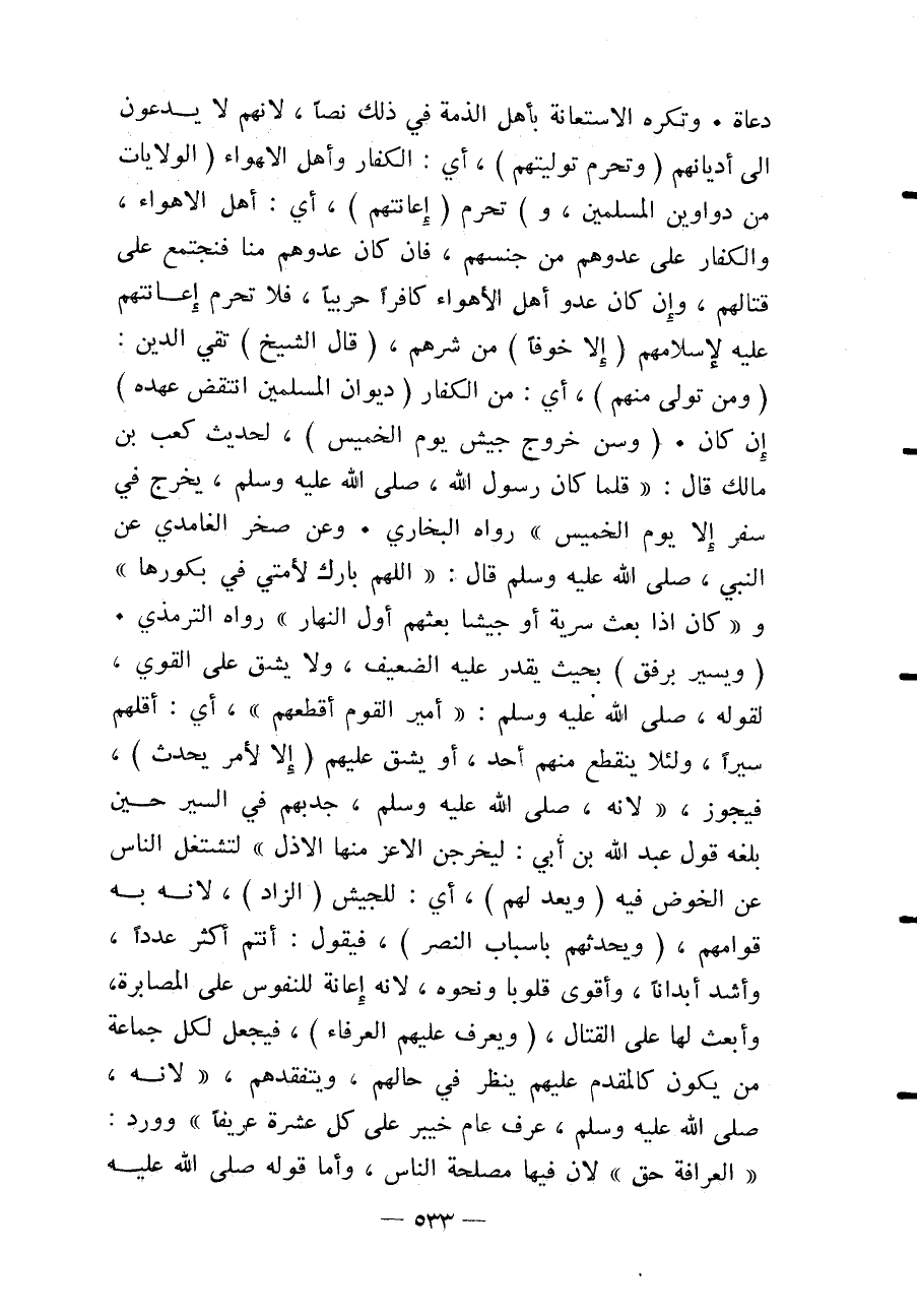 (وَتَحْرُمُ تَوْلِيَتُهُمْ) ، أَيْ: الْكُفَّارِ وَأَهْلِ الْأَهْوَاءِ (الْوِلَايَاتِ مِنْ دَوَاوِينِ الْمُسْلِمِينَ، وَ) تَحْرُمُ (إعَانَتُهُمْ) ، أَيْ: أَهْلِ الْأَهْوَاءِ، وَالْكُفَّارِ عَلَى عَدُوِّهِمْ مِنْ جِنْسِهِمْ، فَإِنْ كَانَ عَدُوُّهُمْ مِنَّا فَنَجْتَمِعُ عَلَى قِتَالِهِمْ، وَإِنْ كَانَ عَدُوُّ أَهْلِ الْأَهْوَاءِ كَافِرًا حَرْبِيًّا، فَلَا تَحْرُمُ إعَانَتُهُمْ عَلَيْهِ لِإِسْلَامِهِمْ (إلَّا خَوْفًا) مِنْ شَرِّهِمْ، (قَالَ الشَّيْخُ) تَقِيُّ الدِّينِ: (وَمَنْ تَوَلَّى مِنْهُمْ) ، أَيْ: مِنْ الْكُفَّارِ (دِيوَانَ الْمُسْلِمِينَ انْتَقَضَ عَهْدُهُ) إنْ كَانَ.