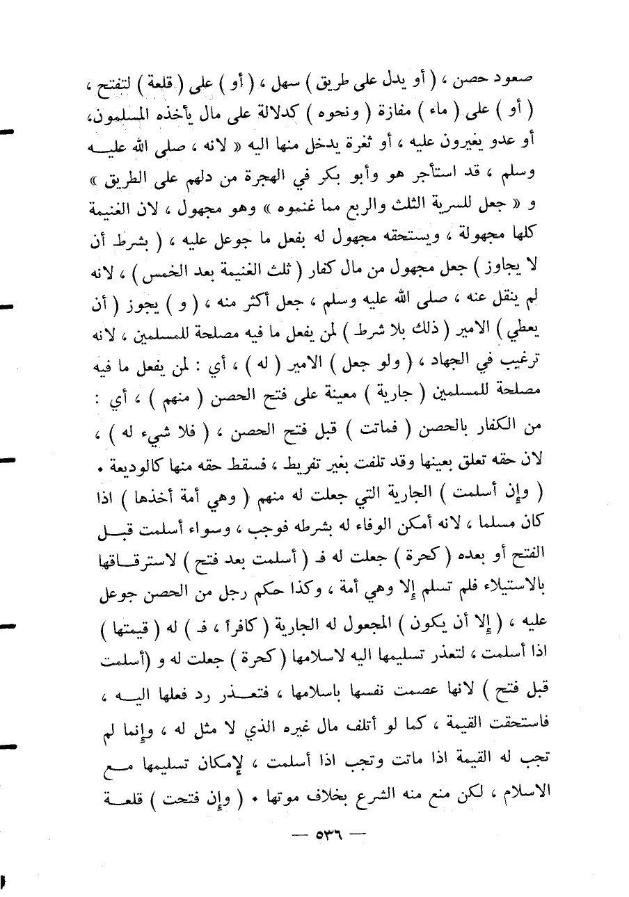 صُعُودِ حِصْنٍ، (أَوْ يَدُلُّ عَلَى طَرِيقٍ) سَهْلٍ، (أَوْ) عَلَى (قَلْعَةٍ) لِتُفْتَحَ، (أَوْ) عَلَى (مَاءِ) مَفَازَةٍ (وَنَحْوِهِ) كَدَلَالَةٍ عَلَى مَالٍ يَأْخُذُهُ الْمُسْلِمُونَ، أَوْ عَدُوٍّ يُغِيرُونَ عَلَيْهِ، أَوْ ثُغْرَةٍ يَدْخُلُ مِنْهَا إلَيْهِ لِأَنَّهُ - صَلَّى اللَّهُ عَلَيْهِ وَسَلَّمَ - «قَدْ اسْتَأْجَرَ هُوَ وَأَبُو بَكْرٍ فِي الْهِجْرَةِ مَنْ دَلَّهُمْ عَلَى الطَّرِيقِ» وَ «جَعَلَ لِلسَّرِيَّةِ الثُّلُثَ وَالرُّبْعَ مِمَّا غَنِمُوهُ» وَهُوَ مَجْهُولٌ، لِأَنَّ الْغَنِيمَةَ كُلَّهَا مَجْهُولَةٌ، وَيَسْتَحِقُّهُ مَجْهُولٌ لَهُ بِفِعْلِ مَا جُوعِلَ عَلَيْهِ، (بِشَرْطِ أَنْ لَا يُجَاوِزَ) جَعْلُ مَجْهُولٍ مِنْ مَالِ كُفَّارٍ (ثُلُثَ الْغَنِيمَةِ بَعْدَ الْخُمُسِ) ، لِأَنَّهُ لَمْ يُنْقَلْ عَنْهُ - صَلَّى اللَّهُ عَلَيْهِ وَسَلَّمَ - جَعْلٌ أَكْثَرَ مِنْهُ (وَ) يَجُوزُ (أَنْ يُعْطِيَ) الْأَمِيرُ (ذَلِكَ بِلَا شَرْطٍ) لِمَنْ يَفْعَلُ مَا فِيهِ مَصْلَحَةٌ لِلْمُسْلِمِينَ، لِأَنَّهُ تَرْغِيبٌ فِي الْجِهَادِ.