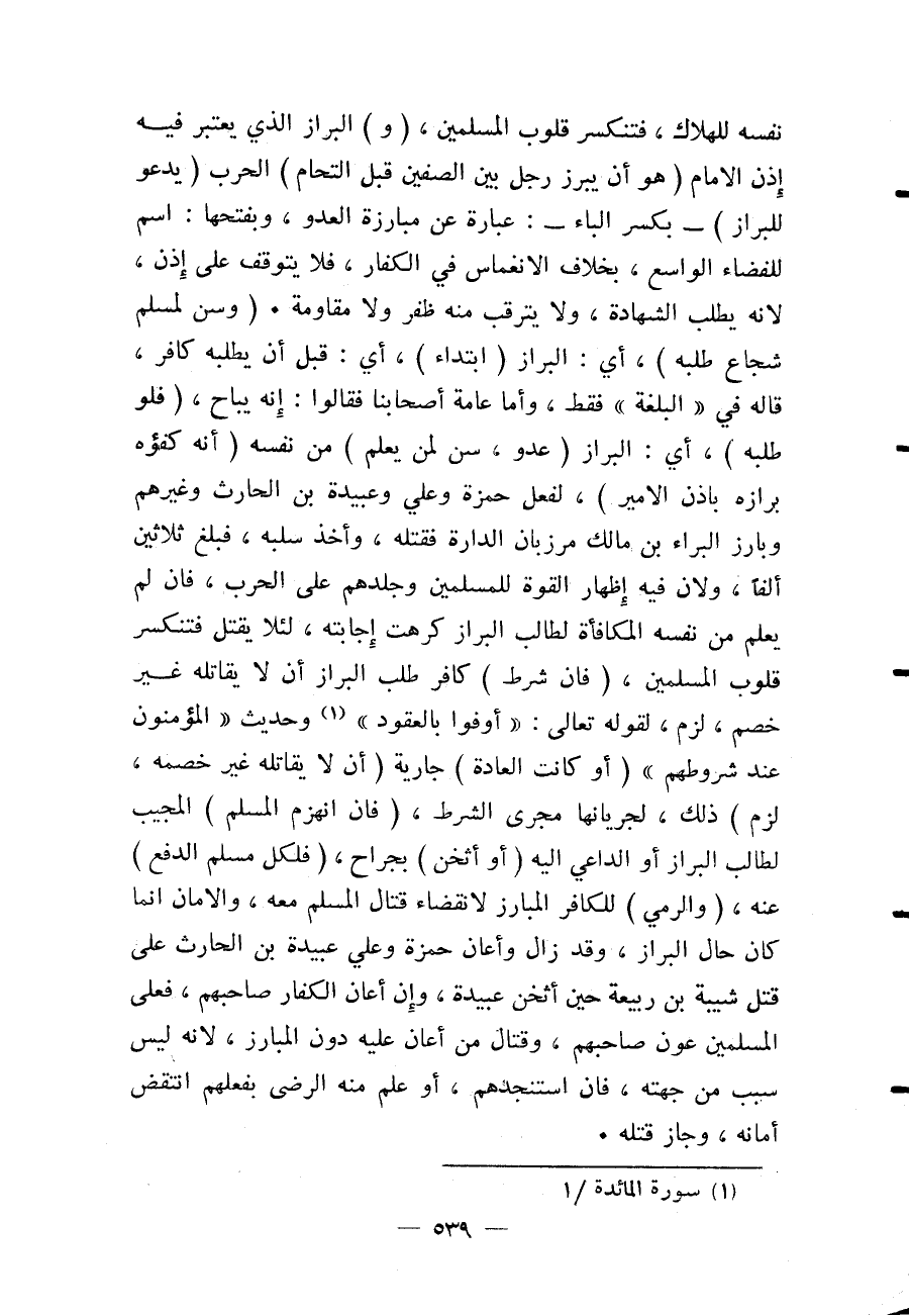 نَفْسَهُ لِلْهَلَاكِ، فَتَنْكَسِرُ قُلُوبُ الْمُسْلِمِينَ، (وَ) الْبِرَازُ الَّذِي يُعْتَبَرُ فِيهِ إذْنُ الْإِمَامِ (هُوَ أَنْ يَبْرُزَ رَجُلٌ بَيْنَ الصَّفَّيْنِ قَبْلَ الْتِحَامِ) الْحَرْبِ (يَدْعُو لِلْبِرَازِ) - بِكَسْرِ الْبَاءِ -: عِبَارَةٌ عَنْ مُبَارَزَةِ الْعَدُوِّ، وَبِفَتْحِهَا: اسْمٌ لِلْفَضَاءِ الْوَاسِعِ، بِخِلَافِ الِانْغِمَاسِ فِي الْكُفَّارِ، فَلَا يَتَوَقَّفُ عَلَى إذْنٍ لِأَنَّهُ يَطْلُبُ الشَّهَادَةَ، وَلَا يُتَرَقَّبُ مِنْهُ ظَفَرٌ وَلَا مُقَاوَمَةٌ (وَسُنَّ لِمُسْلِمٍ شُجَاعٍ طَلَبُهُ) ، أَيْ: الْبِرَازُ (ابْتِدَاءً) ، أَيْ: قَبْلَ أَنْ يَطْلُبَهُ كَافِرٌ، قَالَهُ فِي " الْبُلْغَةِ، فَقَطْ، وَأَمَّا عَامَّةُ أَصْحَابِنَا فَقَالُوا: إنَّهُ يُبَاحُ، (فَلَوْ طَلَبَهُ) ، أَيْ: الْبِرَازَ (عَدُوٌّ، سُنَّ لِمَنْ يَعْلَمُ) مِنْ نَفْسِهِ (أَنَّهُ كُفْؤُهُ بِرَازُهُ بِإِذْنِ الْأَمِيرِ) ، لِفِعْلِ حَمْزَةَ وَعَلِيٍّ وَعُبَيْدَةَ بْنِ الْحَارِثِ وَغَيْرِهِمْ وَبَارَزَ الْبَرَاءُ بْنُ مَالِكٍ مَرْزُبَانَ الدَّارَةِ فَقَتَلَهُ، وَأَخَذَ سَلَبَهُ، فَبَلَغَ ثَلَاثِينَ أَلْفًا، وَلِأَنَّ فِيهِ إظْهَارَ الْقُوَّةِ لِلْمُسْلِمِينَ وَجَلَدِهِمْ عَلَى الْحَرْبِ، فَإِنْ لَمْ يَعْلَمْ مِنْ نَفْسِهِ الْمُكَافَأَةَ لِطَالِبِ الْبِرَازِ كُرِهَتْ إجَابَتُهُ، لِئَلَّا يُقْتَلَ فَتَنْكَسِرُ قُلُوبُ الْمُسْلِمِينَ، (فَإِنْ شَرَطَ) كَافِرٌ طَلَبَ الْبِرَازِ أَنْ لَا يُقَاتِلَهُ غَيْرُ خَصْمٍ، لَزِمَ لِقَوْلِهِ تَعَالَى: {أَوْفُوا بِالْعُقُودِ} [المائدة: 1] وَحَدِيثِ «الْمُؤْمِنُونَ عِنْدَ شُرُوطِهِمْ» (أَوْ كَانَتْ الْعَادَةُ) جَارِيَةً (أَنْ لَا يُقَاتِلَهُ غَيْرُ خَصْمِهِ، لَزِمَ) ذَلِكَ، لِجَرَيَانِهَا مَجْرَى الشَّرْطِ، (فَإِنْ انْهَزَمَ الْمُسْلِمُ) الْمُجِيبُ لِطَالِبِ الْبِرَازِ أَوْ الدَّاعِي إلَيْهِ (أَوْ أُثْخِنَ) بِجِرَاحٍ، (فَلِكُلِّ مُسْلِمٍ الدَّفْعُ) عَنْهُ، (وَالرَّمْيُ) لِلْكَافِرِ الْمُبَارِزِ لِانْقِضَاءِ قِتَالِ الْمُسْلِمِ مَعَهُ، وَالْأَمَانُ إنَّمَا كَانَ حَالَ الْبِرَازِ، وَقَدْ زَالَ وَأَعَانَ حَمْزَةُ وَعَلِيٌّ عُبَيْدَةَ بْنَ الْحَارِثِ عَلَى قَتْلِ شَيْبَةَ بْنَ رَبِيعَةَ حِينَ أَثْخَنَ عُبَيْدَةَ، وَإِنْ أَعَانَ الْكُفَّارُ صَاحِبَهُمْ، فَعَلَى الْمُسْلِمِينَ عَوْنُ صَاحِبِهِمْ، وَقِتَالُ مَنْ أَعَانَ عَلَيْهِ دُونَ الْمُبَارِزِ، لِأَنَّهُ لَيْسَ سَبَبٌ مِنْ جِهَتِهِ، فَإِنْ اسْتَنْجَدَهُمْ، أَوْ عُلِمَ مِنْهُ الرِّضَى بِفِعْلِهِمْ انْتَقَضَ أَمَانُهُ، وَجَازَ قَتْلُهُ.