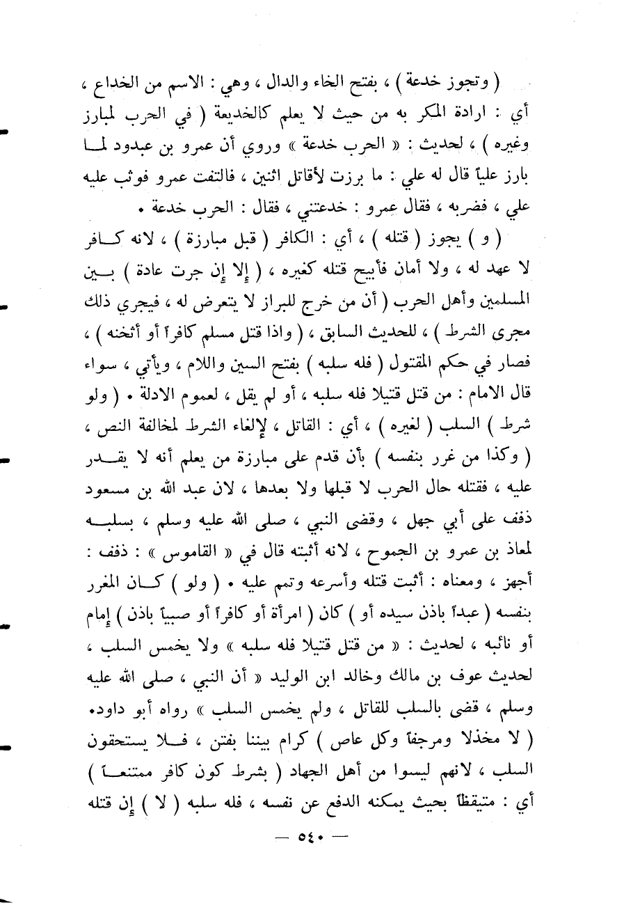 (وَ) يَجُوزُ (قَتْلُهُ) ، أَيْ: الْكَافِرِ (قَبْلَ مُبَارَزَةٍ) ، لِأَنَّهُ كَافِرٌ لَا عَهْدَ لَهُ، وَلَا أَمَانَ فَأُبِيحَ قَتْلُهُ كَغَيْرِهِ، (إلَّا إنْ جَرَتْ عَادَةٌ) بَيْنَ الْمُسْلِمِينَ وَأَهْلِ الْحَرْبِ (أَنَّ مَنْ خَرَجَ لِلْبِرَازِ لَا يَتَعَرَّضُ لَهُ، فَيَجْرِي ذَلِكَ مَجْرَى الشَّرْطِ) ، لِلْحَدِيثِ السَّابِقِ، (وَإِذَا قَتَلَ مُسْلِمٌ كَافِرًا أَوْ أَثْخَنَهُ) ، فَصَارَ فِي حُكْمِ الْمَقْتُولِ (فَلَهُ سَلَبُهُ) بِفَتْحِ السِّينِ وَاللَّامِ، وَيَأْتِي، سَوَاءٌ قَالَ الْإِمَامُ: مَنْ قَتَلَ قَتِيلًا فَلَهُ سَلَبُهُ، أَوْ لَمْ يَقُلْ، لِعُمُومِ الْأَدِلَّةِ (وَلَوْ شَرَطَ) السَّلَبَ (لِغَيْرِهِ) ، أَيْ: الْقَاتِلِ، لِإِلْغَاءِ الشَّرْطِ لِمُخَالَفَةِ النَّصِّ، (وَكَذَا مَنْ غَرَّرَ بِنَفْسِهِ) بِأَنْ قَدِمَ عَلَى مُبَارَزَةِ مَنْ يَعْلَمُ أَنَّهُ لَا يَقْدِرُ عَلَيْهِ، فَقَتَلَهُ حَالَ الْحَرْبِ لَا قَبْلَهَا وَلَا بَعْدَهَا، لِأَنَّ عَبْدَ اللَّهِ بْنَ مَسْعُودٍ ذَفَفَ عَلَى أَبِي جَهْلٍ، «وَقَضَى النَّبِيُّ - صَلَّى اللَّهُ عَلَيْهِ وَسَلَّمَ - بِسَلَبِهِ لِمُعَاذِ بْنِ عَمْرِو بْنِ الْجَمُوحِ» ، لِأَنَّهُ أَثْبَتُهُ قَالَ فِي " الْقَامُوسِ ": ذَفَفَ: أَجْهَزَ، وَمَعْنَاهُ: أَثْبَتَ قَتْلَهُ وَأَسْرَعَهُ وَتَمَّمَ عَلَيْهِ. (وَلَوْ) كَانَ الْمُغَرِّرُ بِنَفْسِهِ (عَبْدًا بِإِذْنِ سَيِّدِهِ أَوْ) كَانَ (امْرَأَةً أَوْ كَافِرًا أَوْ صَبِيًّا بِإِذْنِ) إمَامٍ أَوْ نَائِبِهِ، لِحَدِيثِ: «مَنْ قَتَلَ قَتِيلًا فَلَهُ سَلَبُهُ» وَلَا يُخَمَّسُ السَّلَبُ، لِحَدِيثِ عَوْفِ بْنِ مَالِكٍ وَخَالِدِ بْنِ الْوَلِيدِ أَنَّ النَّبِيَّ - صَلَّى اللَّهُ عَلَيْهِ وَسَلَّمَ - «قَضَى بِالسَّلَبِ لِلْقَاتِلِ، وَلَمْ يُخَمِّسْ السَّلَبَ» رَوَاهُ أَبُو دَاوُد.