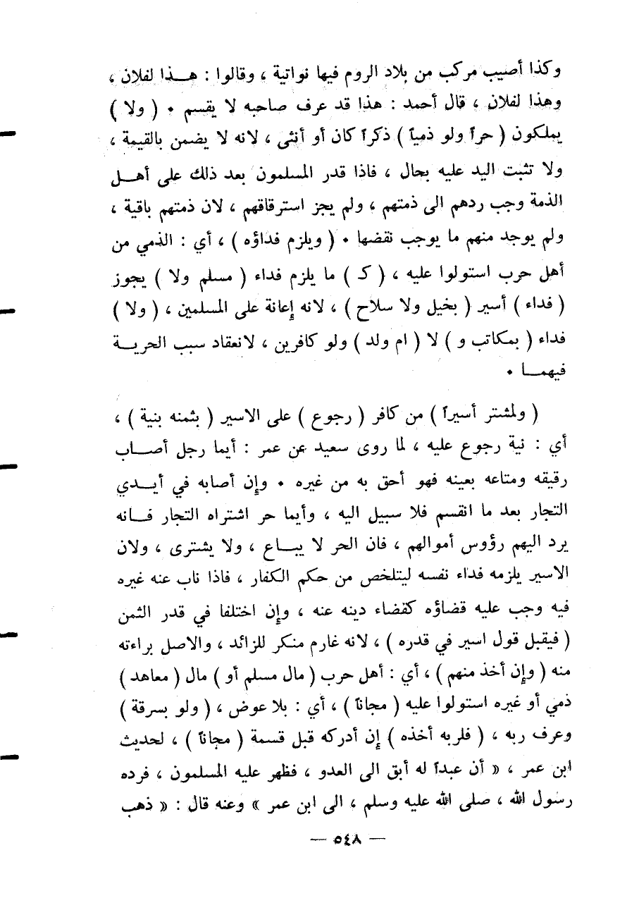 (وَلِمُشْتَرٍ أَسِيرًا) مِنْ كَافِرٍ (رُجُوعٌ) عَلَى الْأَسِيرِ (بِثَمَنِهِ بِنِيَّةٍ) ، أَيْ: نِيَّةِ رُجُوعٍ عَلَيْهِ، لِمَا رَوَى سَعِيدٌ عَنْ عُمَرَ: أَيُّمَا رَجُلٍ أَصَابَ رَقِيقَهُ وَمَتَاعَهُ بِعَيْنِهِ فَهُوَ أَحَقُّ بِهِ مِنْ غَيْرِهِ وَإِنْ أَصَابَهُ فِي أَيْدِي التُّجَّارِ بَعْدَ مَا انْقَسَمَ فَلَا سَبِيلَ إلَيْهِ، وَأَيُّمَا حُرٍّ اشْتَرَاهُ التُّجَّارُ فَإِنَّهُ يَرُدُّ إلَيْهِمْ رُءُوسَ أَمْوَالِهِمْ، فَإِنَّ الْحُرَّ لَا يُبَاعُ، وَلَا يُشْتَرَى، وَلِأَنَّ الْأَسِيرَ يَلْزَمُهُ فِدَاءُ نَفْسِهِ لِيَتَخَلَّصَ مِنْ حُكْمِ الْكُفَّارِ، فَإِذَا نَابَ عَنْهُ غَيْرُهُ فِيهِ وَجَبَ عَلَيْهِ قَضَاؤُهُ كَقَضَاءِ دَيْنِهِ عَنْهُ، وَإِنْ اخْتَلَفَا فِي قَدْرِ الثَّمَنِ (فَيُقْبَلُ قَوْلُ أَسِيرٍ فِي قَدْرِهِ) ، لِأَنَّهُ غَارِمٌ مُنْكِرٌ لِلزَّائِدِ، وَالْأَصْلُ بَرَاءَتُهُ مِنْهُ