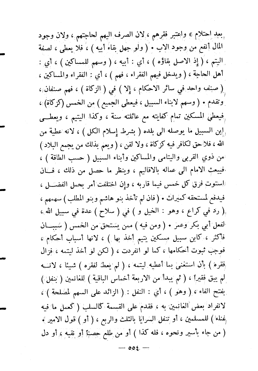 (وَسَهْمٌ لِأَبْنَاءٍ السَّبِيلِ، فَيُعْطَى الْجَمِيعُ) مِنْ الْخُمُسِ (كَزَكَاةٍ) ، فَيُعْطَى الْمِسْكِينُ تَمَامَ كِفَايَتِهِ مَعَ عَائِلَتِهِ سَنَةً، وَكَذَا الْيَتِيمُ، وَيُعْطَى ابْنُ السَّبِيلِ مَا يُوصِلُهُ إلَى بَلَدِهِ (بِشَرْطِ إسْلَامِ الْكُلِّ) ، لِأَنَّهُ عَطِيَّةٌ مِنْ اللَّهِ، فَلَا حَقَّ لِكَافِرٍ فِيهِ كَزَكَاةٍ، وَلَا لِقِنٍّ، (وَيَعُمُّ بِذَلِكَ مَنْ يَجْمَعُ الْبِلَادَ) مِنْ ذَوِي الْقُرْبَى وَالْيَتَامَى وَالْمَسَاكِينِ وَأَبْنَاءِ السَّبِيلِ (حَسَبَ الطَّاقَةِ) ، فَيَبْعَثُ الْإِمَامُ إلَى عُمَّالِهِ بِالْأَقَالِيمِ، وَيَنْظُرُ مَا حَصَلَ مِنْ ذَلِكَ، فَإِنْ اسْتَوَتْ فَرَّقَ كُلَّ خُمُسٍ فِيمَا قَارَبَهُ، وَإِنْ اخْتَلَفَتْ أَمَرَ بِحَمْلِ الْفَضْلِ، فَيُدْفَعُ لِمُسْتَحِقِّهِ كَمِيرَاثٍ.