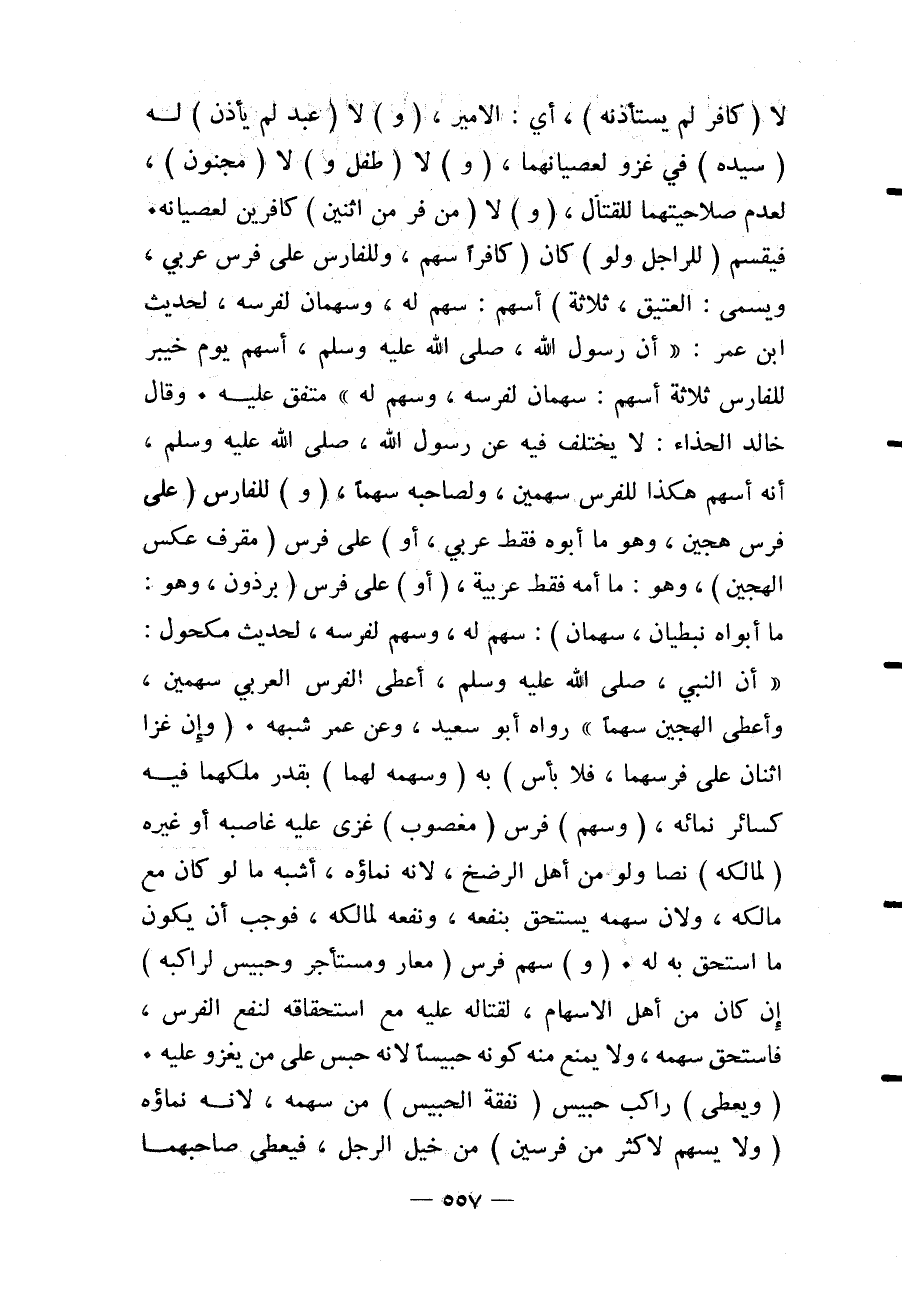 فَيُقَسَّمُ (لِلرَّاجِلِ وَلَوْ) كَانَ (كَافِرًا سَهْمٌ، وَلِلْفَارِسِ عَلَى فَرَسٍ عَرَبِيٍّ، وَيُسَمَّى: الْعَتِيقُ، ثَلَاثَةُ) أَسْهُمٍ: سَهْمٌ لَهُ، وَسَهْمَانِ لِفَرَسِهِ، لِحَدِيثِ ابْنِ عُمَرَ: «أَنَّ رَسُولَ اللَّهِ - صَلَّى اللَّهُ عَلَيْهِ وَسَلَّمَ - أَسْهَمَ يَوْمَ خَيْبَرَ لِلْفَارِسِ ثَلَاثَةَ أَسْهُمٍ: سَهْمَانِ لِفَرَسِهِ، وَسَهْمٌ لَهُ» مُتَّفَقٌ عَلَيْهِ وَقَالَ خَالِدٌ الْحَذَّاءُ: «لَا يُخْتَلَفُ فِيهِ عَنْ رَسُولِ اللَّهِ - صَلَّى اللَّهُ عَلَيْهِ وَسَلَّمَ - أَنَّهُ أَسْهَمَ هَكَذَا لِلْفَرَسِ سَهْمَيْنِ، وَلِصَاحِبِهِ سَهْمًا» ، (وَ) لِلْفَارِسِ (عَلَى فَرَسٍ هَجِينٍ، وَهُوَ مَا أَبُوهُ فَقَطْ عَرَبِيٌّ، أَوْ) عَلَى فَرَسٍ (مُقْرِفٍ عَكْسُ الْهَجِينِ) ، وَهُوَ: مَا أُمُّهُ فَقَطْ عَرَبِيَّةٌ، (أَوْ) عَلَى فَرَسِ (بِرْذَوْنٍ، وَهُوَ: مَا أَبَوَاهُ نَبَطِيَّانِ، سَهْمَانِ) : سَهْمٌ لَهُ، وَسَهْمٌ لِفَرَسِهِ، لِحَدِيثِ مَكْحُولٍ: «أَنَّ النَّبِيَّ - صَلَّى اللَّهُ عَلَيْهِ وَسَلَّمَ - أَعْطَى الْفَرَسَ الْعَرَبِيَّ سَهْمَيْنِ، وَأَعْطَى الْهَجِينَ سَهْمًا» رَوَاهُ أَبُو سَعِيدٍ، وَعَنْ عُمَرَ شَبَهُهُ.