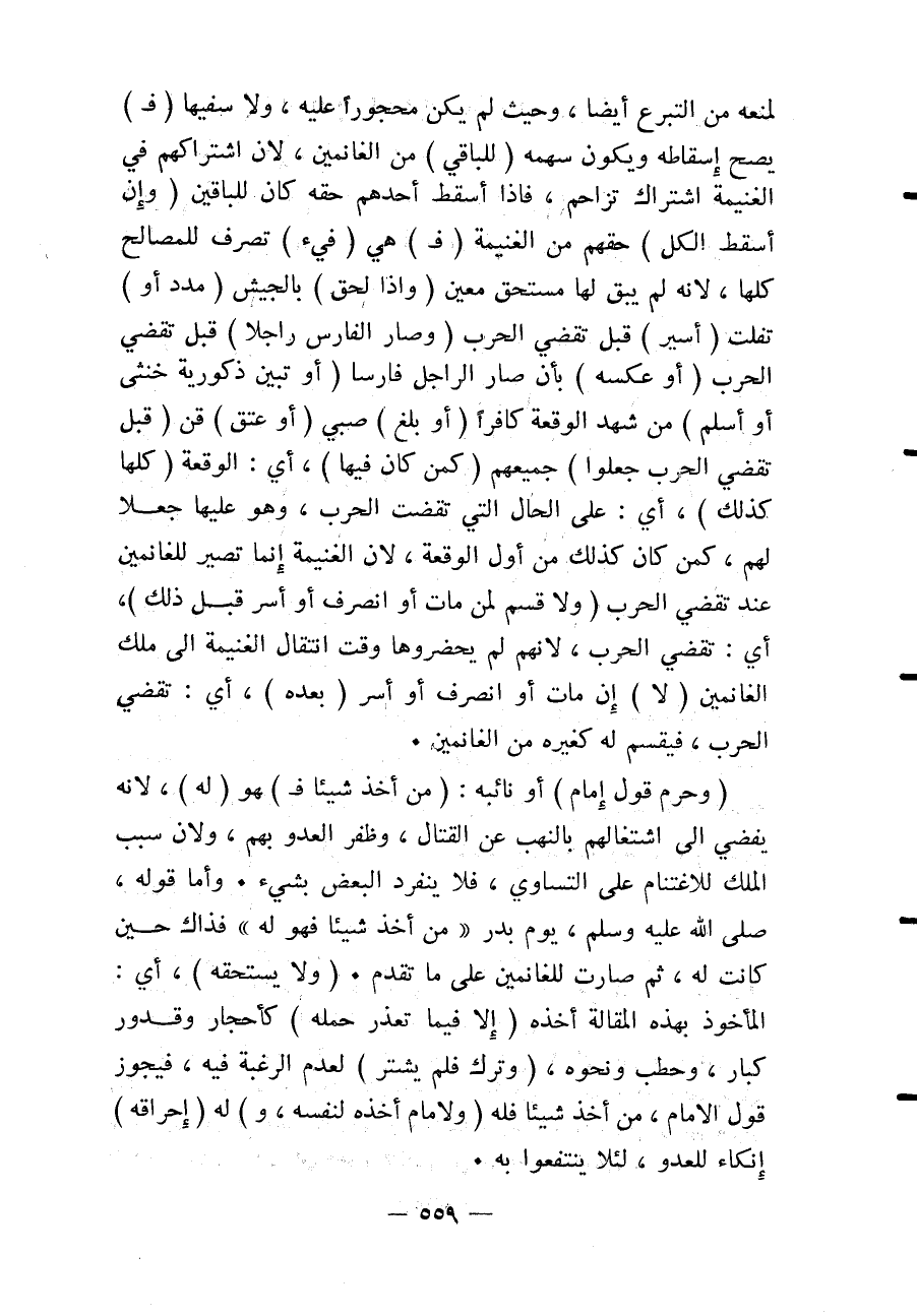 لِمَنْعِهِ مِنْ التَّبَرُّعِ أَيْضًا، وَحَيْثُ لَمْ يَكُنْ مَحْجُورًا عَلَيْهِ، وَلَا سَفِيهًا (ف) يَصِحُّ إسْقَاطُهُ وَيَكُونُ سَهْمُهُ (لِلْبَاقِي) مِنْ الْغَانِمِينَ، لِأَنَّ اشْتِرَاكَهُمْ فِي الْغَنِيمَةِ اشْتِرَاكُ تَزَاحُمٍ، فَإِذَا أَسْقَطَ أَحَدُهُمْ حَقَّهُ كَانَ لِلْبَاقِينَ (وَإِنْ أَسْقَطَ الْكُلُّ) حَقَّهُمْ مِنْ الْغَنِيمَةِ (ف) هِيَ (فَيْءٌ) تُصْرَفُ لِلْمَصَالِحِ كُلِّهَا، لِأَنَّهُ لَمْ يَبْقَ لَهَا مُسْتَحِقٌّ مُعَيَّنٌ