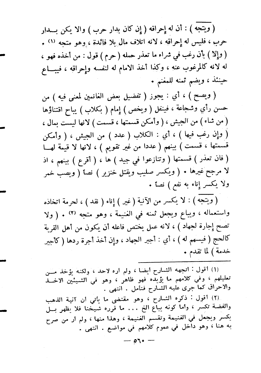 (وَيَتَّجِهُ) : أَنَّ لَهُ إحْرَاقَهُ (إنْ كَانَ بِدَارِ حَرْبٍ) وَإِلَّا يَكُنْ بِدَارِ حَرْبٍ، فَلَيْسَ لَهُ إحْرَاقُهُ، لِأَنَّهُ إتْلَافُ مَالٍ بِلَا فَائِدَةٍ، وَهُوَ مُتَّجِهٌ (وَإِلَّا) بِأَنْ رَغَّبَ فِي شِرَاءِ مَا تَعَذَّرَ حَمْلُهُ (حَرُمَ) قَوْلُ: مَنْ أَخَذَهُ فَهُوَ لَهُ لِأَنَّهُ كَالْمَرْغُوبِ عَنْهُ، وَكَذَا أَخْذُ الْإِمَامِ لَهُ لِنَفْسِهِ وَإِحْرَاقُهُ، فَيُبَاعُ حِينَئِذٍ، وَيُضَمُّ ثَمَنُهُ لِلْمَغْنَمِ.
