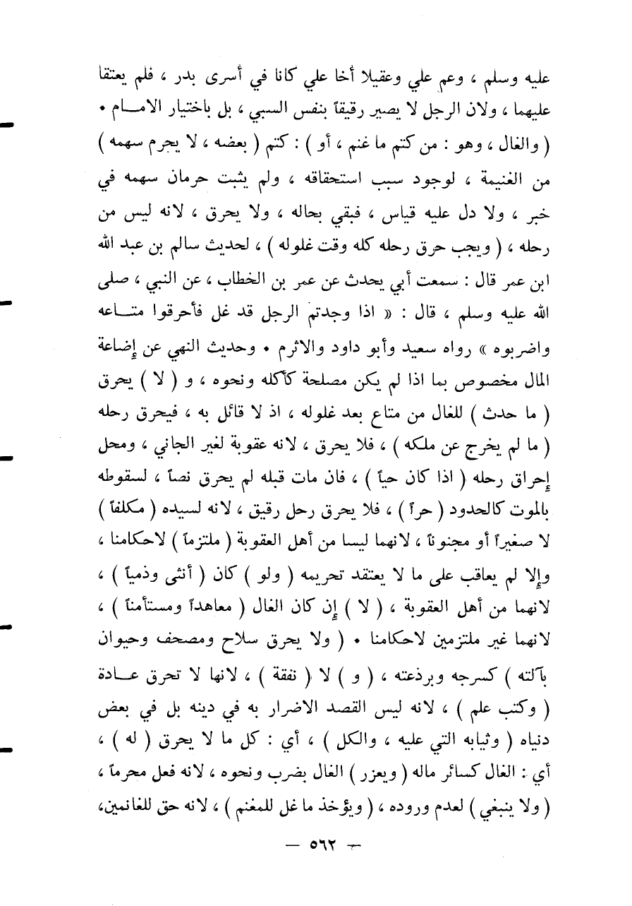 (وَالْغَالُّ، وَهُوَ: مَنْ كَتَمَ مَا غَنِمَ، أَوْ) : كَتَمَ (بَعْضَهُ، لَا يُحْرَمُ سَهْمَهُ) مِنْ الْغَنِيمَةِ، لِوُجُودِ سَبَبِ اسْتِحْقَاقِهِ، وَلَمْ يَثْبُتْ حِرْمَانُ سَهْمِهِ فِي خَبَرٍ، وَلَا دَلَّ عَلَيْهِ قِيَاسٌ، فَبَقِيَ بِحَالِهِ، وَلَا يُحْرَقُ، لِأَنَّهُ لَيْسَ مِنْ رَحْلِهِ، (وَيَجِبُ حَرْقُ رَحْلِهِ كُلِّهِ وَقْتَ غُلُولِهِ) ، لِحَدِيثِ سَالِمِ بْنِ عَبْدِ اللَّهِ بْنِ عُمَرَ قَالَ: سَمِعْت أَبِي يُحَدِّثُ عَنْ عُمَرَ بْنِ الْخَطَّابِ، عَنْ النَّبِيِّ - صَلَّى اللَّهُ عَلَيْهِ وَسَلَّمَ - قَالَ: «إذَا وَجَدْتُمْ الرَّجُلَ قَدْ غَلَّ فَأَحْرِقُوا مَتَاعَهُ وَاضْرِبُوهُ» رَوَاهُ سَعِيدٌ وَأَبُو دَاوُد وَالْأَثْرَمُ وَحَدِيثُ النَّهْيِ عَنْ إضَاعَةِ الْمَالِ مَخْصُوصٌ بِمَا إذَا لَمْ يَكُنْ مَصْلَحَةً كَأَكْلِهِ وَنَحْوِهِ، و (لَا) يُحْرَقُ (مَا حَدَثَ) لِلْغَالِّ مِنْ مَتَاعٍ بَعْدَ غُلُولِهِ، إذْ لَا قَائِلَ بِهِ، فَيُحْرَقُ رَحْلُهُ (مَا لَمْ يَخْرُجْ عَنْ مِلْكِهِ) ، فَلَا يُحْرَقُ، لِأَنَّهُ عُقُوبَةٌ لِغَيْرِ الْجَانِي، وَمَحَلُّ إحْرَاقِ رَحْلِهِ (إذَا كَانَ حَيًّا) ، فَإِنْ مَاتَ قَبْلَهُ لَمْ يُحْرَقْ نَصًّا، لِسُقُوطِهِ بِالْمَوْتِ كَالْحُدُودِ (حُرًّا) ، فَلَا يُحْرَقُ رَحْلُ رَقِيقٍ، لِأَنَّهُ لِسَيِّدِهِ (مُكَلَّفًا) لَا صَغِيرًا أَوْ مَجْنُونًا، لِأَنَّهُمَا لَيْسَا مِنْ أَهْلِ الْعُقُوبَةِ (مُلْتَزِمًا) لِأَحْكَامِنَا، وَإِلَّا لَمْ يُعَاقَبْ عَلَى مَا لَا يُعْتَقَدُ تَحْرِيمُهُ (وَلَوْ) كَانَ (أُنْثَى وَذِمِّيًّا) ، لِأَنَّهُمَا مِنْ أَهْلِ الْعُقُوبَةِ، (لَا) إنْ كَانَ الْغَالُّ (مُعَاهِدًا وَمُسْتَأْمَنًا) ، لِأَنَّهُمَا غَيْرُ مُلْتَزِمَيْنِ لِأَحْكَامِنَا (وَلَا يُحْرَقُ سِلَاحٌ وَمُصْحَفٌ وَحَيَوَانٌ بِآلَتِهِ) كَسَرْجِهِ وَبَرْذعَتِه، (وَ) لَا (نَفَقَةٌ) ، لِأَنَّهَا لَا تُحْرَقُ عَادَةً (وَكُتُبُ عِلْمٍ) ، لِأَنَّهُ لَيْسَ الْقَصْدُ الْإِضْرَارَ بِهِ فِي دِينِهِ بَلْ فِي بَعْضِ دُنْيَاهُ (وَثِيَابُهُ الَّتِي عَلَيْهِ، وَالْكُلُّ) ، أَيْ: كُلُّ مَا لَا يُحْرَقُ (لَهُ) ، أَيْ: الْغَالِّ كَسَائِرِ مَالِهِ (وَيُعَزَّرُ) الْغَالُّ بِضَرْبٍ وَنَحْوِهِ، لِأَنَّهُ فَعَلَ مُحَرَّمًا، (وَلَا يَنْبَغِي) لِعَدَمِ وُرُودِهِ، (وَيُؤْخَذُ مَا غَلَّ لِلْمَغْنَمِ) ، لِأَنَّهُ حَقٌّ لِلْغَانِمِينَ،