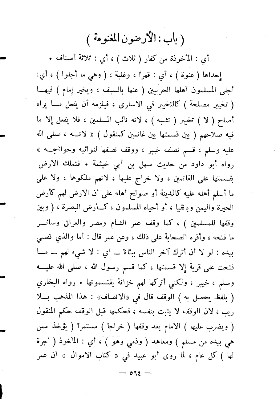 (بَابٌ: الْأَرْضُونَ الْمَغْنُومَةُ) أَيْ: الْمَأْخُوذَةُ مِنْ كُفَّارٍ (ثَلَاثٌ) ، أَيْ: ثَلَاثَةُ أَصْنَافٍ إحْدَاهَا (عَنْوَةً) ، أَيْ: قَهْرًا، وَغَلَبَةً، (وَهِيَ مَا أُجْلُوا) ، أَيْ: أَجْلَى الْمُسْلِمُونَ أَهْلَهَا الْحَرْبِيِّينَ (عَنْهَا بِالسَّيْفِ، وَيُخَيَّرُ إمَامٌ) فِيهَا (تَخْيِيرَ مَصْلَحَةٍ) كَالتَّخْيِيرِ فِي الْأُسَارَى، فَيَلْزَمُهُ أَنْ يَفْعَلَ مَا يَرَاهُ أَصْلَحَ (لَا) تَخْيِيرَ (تَشَبُّهٍ) ، لِأَنَّهُ نَائِبُ الْمُسْلِمِينَ، فَلَا يَفْعَلُ إلَّا مَا فِيهِ صَلَاحُهُمْ (بَيْنَ قِسْمَتِهَا بَيْنَ غَانِمِينَ كَمَنْقُولٍ) لِأَنَّهُ - صَلَّى اللَّهُ عَلَيْهِ وَسَلَّمَ - «قَسَمَ نِصْفَ خَيْبَرَ، وَوَقَفَ نِصْفَهَا لِنَوَائِبِهِ وَحَوَائِجِهِ» رَوَاهُ أَبُو دَاوُد مِنْ حَدِيثِ سَهْلِ بْنِ أَبِي خَيْثَمَةَ فَتُمَلَّكُ الْأَرْضُ بِقِسْمَتِهَا عَلَى الْغَانِمِينَ، وَلَا خَرَاجَ عَلَيْهَا، لِأَنَّهُمْ مَلَكُوهَا، وَلَا عَلَى مَا أَسْلَمَ أَهْلُهُ عَلَيْهِ كَالْمَدِينَةِ أَوْ صُولِحَ أَهْلُهُ عَلَى أَنَّ الْأَرْضَ لَهُمْ كَأَرْضِ الْحِيرَةِ وَالْيَمَنِ وبانقيا، أَوْ أَحْيَاهُ الْمُسْلِمُونَ، كَأَرْضِ الْبَصْرَةِ، (وَبَيْنَ وَقْفِهَا لِلْمُسْلِمِينَ) ، كَمَا وَقَفَ عُمَرُ الشَّامَ وَمِصْرَ وَالْعِرَاقَ وَسَائِرَ مَا فَتَحَهُ، وَأَقَرَّهُ الصَّحَابَةُ عَلَى ذَلِكَ، وَعَنْ عُمَرَ قَالَ: أَمَّا وَاَلَّذِي نَفْسِي بِيَدِهِ: لَوْلَا أَنْ أَتْرُكَ آخِرَ النَّاسِ بَيَانًا - أَيْ: لَا شَيْءَ لَهُمْ - مَا فَتَحْت عَلَى قَرْيَةٍ إلَّا قَسَمْتُهَا، كَمَا قَسَمَ رَسُولُ اللَّهِ - صَلَّى اللَّهُ عَلَيْهِ وَسَلَّمَ - خَيْبَرَ، وَلَكِنِّي أَتْرُكُهَا لَهُمْ خِزَانَةً يَقْتَسِمُونَهَا رَوَاهُ الْبُخَارِيُّ (بِلَفْظٍ يَحْصُلُ بِهِ) الْوَقْفُ قَالَ فِي " الْإِنْصَافِ ": هَذَا الْمَذْهَبُ بِلَا رَيْبٍ، لِأَنَّ الْوَقْفَ لَا يَثْبُتُ بِنَفْسِهِ، فَحُكْمُهَا قَبْلَ الْوَقْفِ حُكْمُ الْمَنْقُولِ (وَيَضْرِبُ عَلَيْهَا) الْإِمَامُ بَعْدَ وَقْفِهَا (خَرَاجًا) مُسْتَمِرًّا (يُؤْخَذُ مِمَّنْ هِيَ بِيَدِهِ مِنْ مُسْلِمٍ) وَمُعَاهَدٍ (وَذِمِّيٍّ وَهُوَ) ، أَيْ: الْمَأْخُوذُ (أُجْرَةً لَهَا) كُلُّ عَامٍ، لِمَا رَوَى أَبُو عُبَيْدٍ فِي " كِتَابِ الْأَمْوَالِ " أَنَّ عُمَرَ