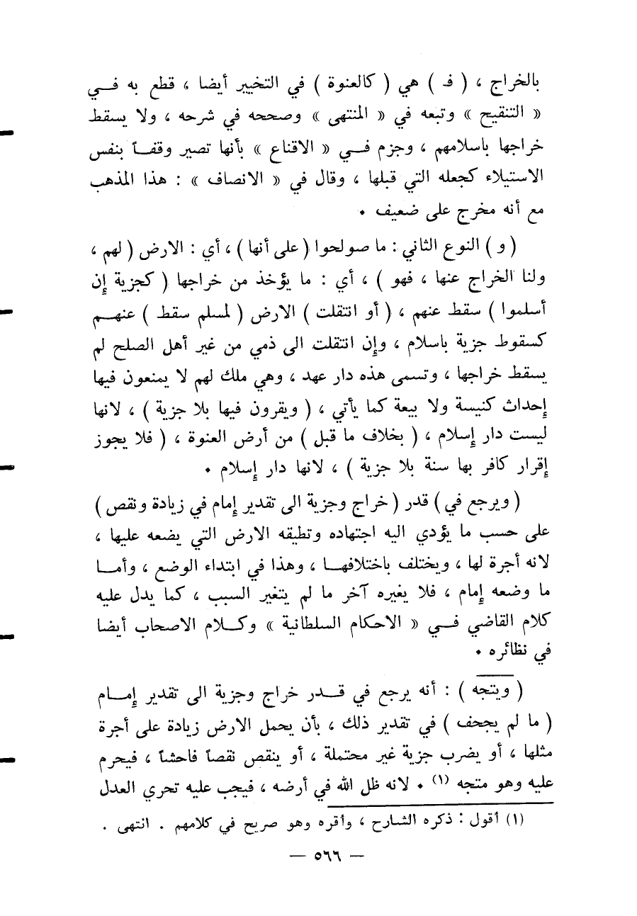 (وَيَرْجِعُ فِي) قَدْرِ (خَرَاجٍ وَجِزْيَةٍ إلَى تَقْدِيرِ إمَامٍ فِي زِيَادَةٍ وَنَقْصٍ) عَلَى حَسَبِ مَا يُؤَدِّي إلَيْهِ اجْتِهَادُهُ وَتُطِيقُهُ الْأَرْضُ الَّتِي يَضَعُهُ عَلَيْهَا، لِأَنَّهُ أُجْرَةٌ لَهَا، وَيَخْتَلِفُ بِاخْتِلَافِهَا، وَهَذَا فِي ابْتِدَاءِ الْوَضْعِ، وَأَمَّا مَا وَضَعَهُ إمَامٌ، فَلَا يُغَيِّرُهُ آخَرُ مَا لَمْ يَتَغَيَّرْ السَّبَبُ، كَمَا يَدُلُّ عَلَيْهِ كَلَامُ الْقَاضِي فِي " الْأَحْكَامِ السُّلْطَانِيَّةِ " وَكَلَامُ الْأَصْحَابِ أَيْضًا فِي نَظَائِرِهِ (يَتَّجِهُ) : أَنَّهُ يَرْجِعُ فِي قَدْرِ خَرَاجٍ وَجِزْيَةٍ إلَى تَقْدِيرِ إمَامٍ (مَا لَمْ يُجْحِفْ) فِي تَقْدِيرِ ذَلِكَ، بِأَنْ يُحَمِّلَ الْأَرْضَ زِيَادَةً عَلَى أُجْرَةِ مِثْلِهَا، أَوْ يَضْرِبَ جِزْيَةً غَيْرَ مُحْتَمَلَةٍ، أَوْ يُنْقِصَ نَقْصًا فَاحِشًا، فَيَحْرُمُ عَلَيْهِ وَهُوَ مُتَّجِهٌ. لِأَنَّهُ ظِلُّ اللَّهِ فِي أَرْضِهِ، فَيَجِبُ عَلَيْهِ تَحَرِّي الْعَدْلِ
