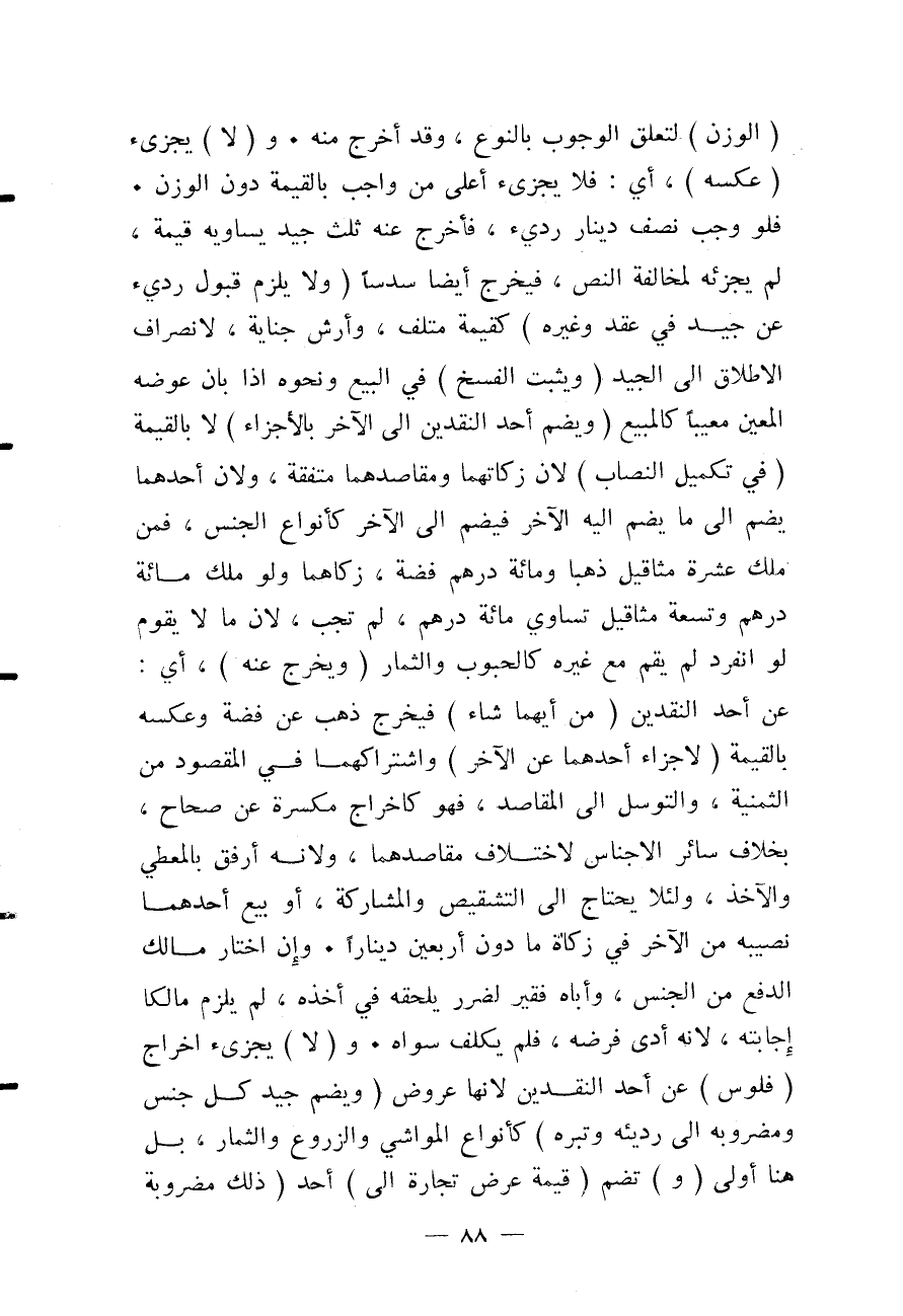 (الْوَزْنِ) لِتَعَلُّقِ الْوُجُوبِ بِالنَّوْعِ، وَقَدْ أَخْرَجَ مِنْهُ. وَ (لَا) يُجْزِئُ (عَكْسُهُ) ، أَيْ: فَلَا يُجْزِئُ أَعْلَى مِنْ وَاجِبٍ بِالْقِيمَةِ دُونَ الْوَزْنِ. فَلَوْ وَجَبَ نِصْفُ دِينَارٍ رَدِيءٍ، فَأَخْرَجَ عَنْهُ ثُلُثَ جَيِّدٍ يُسَاوِيهِ قِيمَةً، لَمْ يُجْزِئْهُ لِمُخَالَفَةِ النَّصِّ، فَيُخْرِجُ أَيْضًا سُدُسًا (وَلَا يَلْزَمُ قَبُولُ رَدِيءٍ عَنْ جَيِّدٍ فِي عَقْدٍ وَغَيْرِهِ) كَقِيمَةِ مُتْلَفٍ، وَأَرْشِ جِنَايَةٍ، لِانْصِرَافِ الْإِطْلَاقِ إلَى الْجَيِّدِ (وَيَثْبُتُ الْفَسْخُ) فِي الْبَيْعِ وَنَحْوِهِ إذَا بَانَ عِوَضُهُ الْمُعَيَّنُ مُعَيَّبًا كَالْمَبِيعِ (وَيُضَمُّ أَحَدُ النَّقْدَيْنِ إلَى الْآخَرِ بِالْأَجْزَاءِ) لَا بِالْقِيمَةِ (فِي تَكْمِيلِ النِّصَابِ) لِأَنَّ زَكَاتَهُمَا وَمَقَاصِدَهُمَا مُتَّفِقَةٌ، وَلِأَنَّ أَحَدَهُمَا يُضَمُّ إلَى مَا يُضَمُّ إلَيْهِ الْآخَرُ فَيُضَمُّ إلَى الْآخَرِ كَأَنْوَاعِ الْجِنْسِ، فَمَنْ مَلَكَ عَشَرَةَ مَثَاقِيلَ ذَهَبًا وَمِائَةَ دِرْهَمٍ فِضَّةٍ، زَكَّاهُمَا وَلَوْ مَلَكَ مِائَةَ دِرْهَمٍ وَتِسْعَةَ مَثَاقِيلَ تُسَاوِي مِائَةَ دِرْهَمٍ، لَمْ تَجِبْ، لِأَنَّ مَا لَا يَقُومُ لَوْ انْفَرَدَ لَمْ يَقُمْ مَعَ غَيْرِهِ كَالْحُبُوبِ وَالثِّمَارِ.