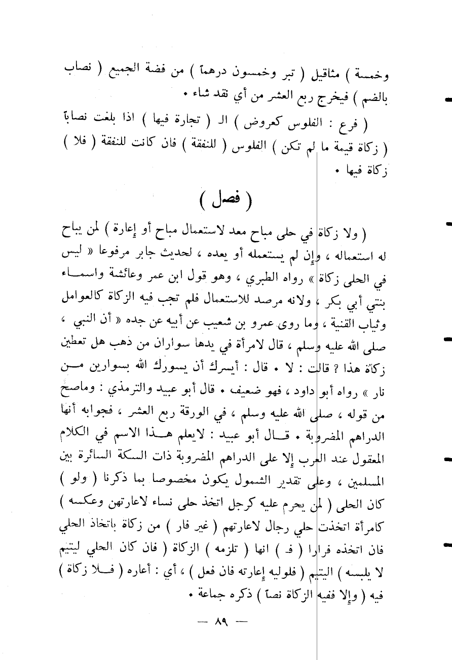 (فَصْلٌ) (وَلَا زَكَاةَ فِي حُلِيٍّ مُبَاحٍ مُعَدٍّ لِاسْتِعْمَالٍ مُبَاحٍ أَوْ إعَارَةٍ) لِمَنْ يُبَاحُ لَهُ اسْتِعْمَالُهُ، وَإِنْ لَمْ يَسْتَعْمِلْهُ أَوْ يَعُدَّهُ، لِحَدِيثِ جَابِرٍ مَرْفُوعًا «لَيْسَ فِي الْحُلِيِّ زَكَاةٌ» رَوَاهُ الطَّبَرِيُّ، وَهُوَ قَوْلُ ابْنِ عُمَرَ وَعَائِشَةَ وَأَسْمَاءَ بِنْتَيْ أَبِي بَكْرٍ، وَلِأَنَّهُ مَرْصَدٌ لِلِاسْتِعْمَالِ فَلَمْ تَجِبْ فِيهِ الزَّكَاةُ كَالْعَوَامِلِ وَثِيَابِ الْقِنْيَةِ، وَمَا رَوَى عَمْرُو بْنُ شُعَيْبٍ عَنْ أَبِيهِ عَنْ جَدِّهِ «أَنَّ النَّبِيَّ - صَلَّى اللَّهُ عَلَيْهِ وَسَلَّمَ - قَالَ لِامْرَأَةٍ فِي يَدِهَا سِوَارَانِ مِنْ ذَهَبٍ هَلْ تُعْطِينَ زَكَاةَ هَذَا؟ قَالَتْ: لَا، قَالَ: أَيَسُرُّكَ أَنْ يُسَوِّرَكِ اللَّهُ بِسِوَارَيْنِ مِنْ نَارٍ» رَوَاهُ أَبُو دَاوُد، فَهُوَ ضَعِيفٌ. قَالَ أَبُو عُبَيْدٍ وَالتِّرْمِذِيُّ: وَمَا صَحَّ مِنْ قَوْلِهِ - صَلَّى اللَّهُ عَلَيْهِ وَسَلَّمَ - «فِي الْوَرِقَةِ رُبُعُ الْعُشْرِ» ، فَجَوَابُهُ أَنَّهَا الدَّرَاهِمُ الْمَضْرُوبَةُ. قَالَ أَبُو عُبَيْدٍ: لَا يُعْلَمُ هَذَا الِاسْمُ فِي الْكَلَامِ الْمَعْقُولِ عِنْدَ الْعَرَب إلَّا عَلَى الدَّرَاهِمِ الْمَضْرُوبَةِ ذَاتِ السِّكَّةِ السَّائِرَةِ بَيْنَ الْمُسْلِمِينَ، وَعَلَى تَقْدِيرِ الشُّمُولِ يَكُونُ مَخْصُوصًا بِمَا ذَكَرْنَا (وَلَوْ) كَانَ الْحُلِيُّ (لِمَنْ يَحْرُمُ عَلَيْهِ كَرَجُلٍ اتَّخَذَ حُلِيَّ نِسَاءٍ لِإِعَارَتِهِنَّ وَعَكْسُهُ) كَامْرَأَةٍ اتَّخَذَتْ حُلِيَّ رِجَالٍ لِإِعَارَتِهِمْ (غَيْرِ فَارٍّ) مِنْ زَكَاةٍ بِاِتِّخَاذِ الْحُلِيِّ فَإِنْ اتَّخَذَهُ فِرَارًا (فَ) أَنَّهَا (تَلْزَمُهُ) الزَّكَاةُ