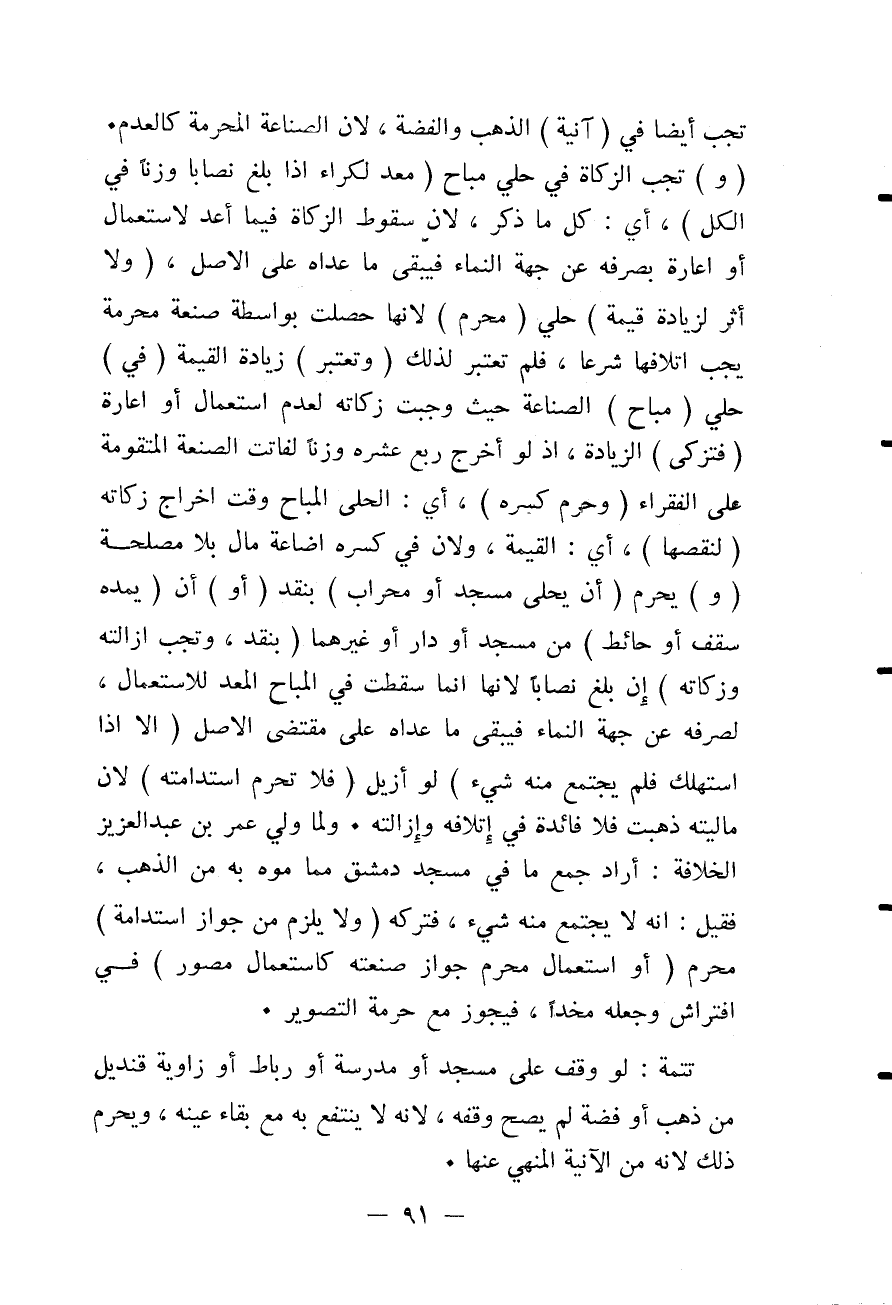 (وَ) يَحْرُمُ (أَنْ يُحَلَّى مَسْجِدٌ أَوْ مِحْرَابٌ) بِنَقْدٍ (أَوْ) أَنْ (يَمُدَّهُ سَقْفٌ أَوْ حَائِطٌ) مِنْ مَسْجِدٍ أَوْ دَارٍ أَوْ غَيْرِهِمَا (بِنَقْدٍ، وَتَجِبُ إزَالَتُهُ وَزَكَاتُهُ) إنْ بَلَغَ نِصَابًا لِأَنَّهَا إنَّمَا سَقَطَتْ فِي الْمُبَاحِ الْمُعَدِّ لِلِاسْتِعْمَالِ، لِصَرْفِهِ عَنْ جِهَةِ النَّمَاءِ فَيَبْقَى مَا عَدَاهُ عَلَى مُقْتَضَى الْأَصْلِ (إلَّا إذَا اُسْتُهْلِكَ فَلَمْ يَجْتَمِعْ مِنْهُ شَيْءٌ) لَوْ أُزِيلَ (فَلَا تَحْرُمُ اسْتِدَامَتُهُ) لِأَنَّ مَالِيَّتَهُ ذَهَبَتْ فَلَا فَائِدَةَ فِي إتْلَافِهِ وَإِزَالَتِهِ. وَلَمَّا وَلِيَ عُمَرُ بْنُ عَبْدِ الْعَزِيزِ الْخِلَافَةَ: أَرَادَ جَمْعَ مَا فِي مَسْجِدِ دِمَشْقَ مِمَّا مُوِّهَ بِهِ مِنْ الذَّهَبِ. فَقِيلَ: إنَّهُ لَا يَجْتَمِعُ مِنْهُ شَيْءٌ، فَتَرَكَهُ (وَلَا يَلْزَمُ مِنْ جَوَازِ اسْتِدَامَةِ) مُحَرَّمٍ (أَوْ اسْتِعْمَالِ مُحَرَّمٍ جَوَازُ صَنْعَتِهِ كَاسْتِعْمَالِ مُصَوَّرٍ) فِي افْتِرَاشٍ وَجَعْلِهِ مِخَدًّا، فَيَجُوزُ مَعَ حُرْمَةِ التَّصْوِيرِ.