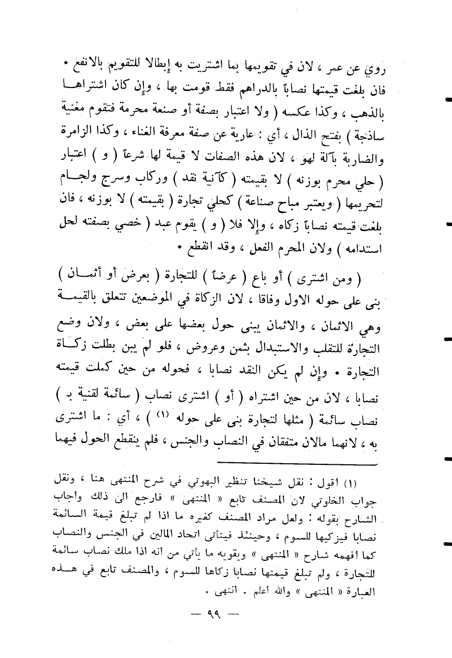 رُوِيَ عَنْ عُمَرَ، لِأَنَّ فِي تَقْوِيمِهَا بِمَا اُشْتُرِيَتْ بِهِ إبْطَالًا لِلتَّقْوِيمِ بِالْأَنْفَعِ. فَإِنْ بَلَغَتْ قِيمَتُهَا نِصَابًا بِالدَّرَاهِمِ فَقَطْ قُوِّمَتْ بِهَا، وَإِنْ كَانَ اشْتَرَاهَا بِالذَّهَبِ، وَكَذَا عَكْسُهُ (وَلَا اعْتِبَارَ بِصِفَةٍ أَوْ صَنْعَةٍ مُحَرَّمَةٍ فَتُقَوَّمُ مُغَنِّيَةٌ سَاذَجَةٌ) بِفَتْحِ الذَّالِ، أَيْ: عَارِيَّةٌ عَنْ صِفَةِ مَعْرِفَةِ الْغِنَاءِ، وَكَذَا الزَّامِرَةُ وَالضَّارِبَةُ بِآلَةِ لَهْوٍ، لِأَنَّ هَذِهِ الصِّفَاتِ لَا قِيمَةَ لَهَا شَرْعًا (وَ) اعْتِبَارُ (حُلِيٍّ مُحَرَّمٍ بِوَزْنِهِ) لَا بِقِيمَتِهِ (كَآنِيَةِ نَقْدٍ) وَرِكَابٍ وَسَرْجٍ وَلِجَامٍ لِتَحْرِيمِهَا (وَيُعْتَبَرُ مُبَاحُ صِنَاعَةٍ) كَحُلِيِّ تِجَارَةٍ (بِقِيمَتِهِ) لَا بِوَزْنِهِ، فَإِنْ بَلَغَتْ قِيمَتُهُ نِصَابًا زَكَّاهُ، وَإِلَّا فَلَا. (وَ) يُقَوَّمُ عَبْدٌ (خَصِيٌّ بِصِفَتِهِ لِحِلِّ اسْتِخْدَامِهِ) وَلِأَنَّ الْمُحَرَّمَ الْفِعْلُ، وَقَدْ انْقَطَعَ.