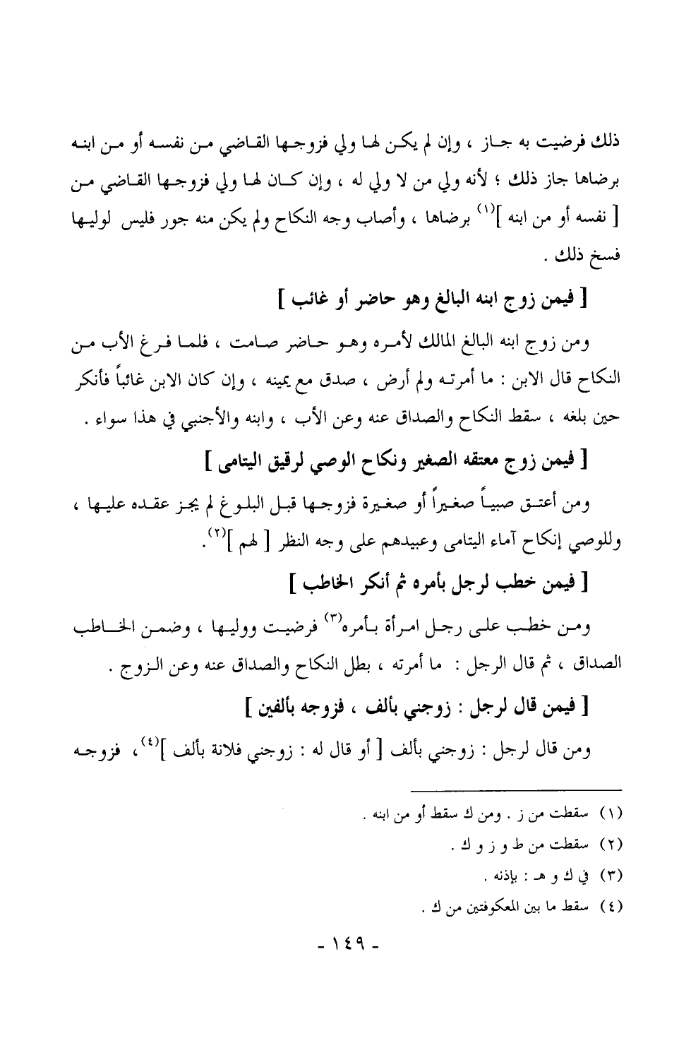 1345 - ومن زوج ابنه البالغ المالك لأمره وهو حاضر صامت، فلما فرغ الأب من النكاح قال الابن: ما أمرته ولم أرض، صدق مع يمينه، وإن كان الابن غائباً فأنكر حين بلغه، سقط النكاح والصداق عنه وعن الأب، وابنه والأجنبي في هذا سواء.