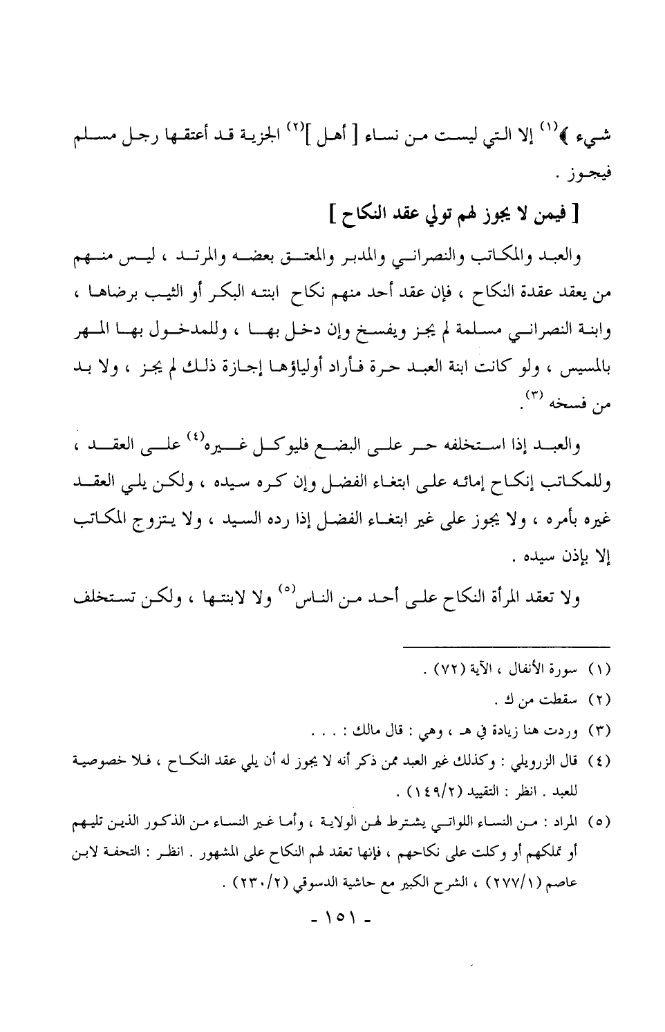 1350 - والعبد والمكاتب والنصراني والمدبر والمعتق بعضه والمرتد، ليس منهم من يعقد عقدة النكاح، فإن عقد أحد منهم نكاح ابنته البكر أو الثيب برضاها، وابنة النصراني مسلمة لم يجز ويفسخ وإن دخل بها، وللمدخول بها المهر بالمسيس، ولو كانت ابنة العبد حرة فأراد أولياؤها إجازة ذلك لم يجز، ولا بد من فسخه.