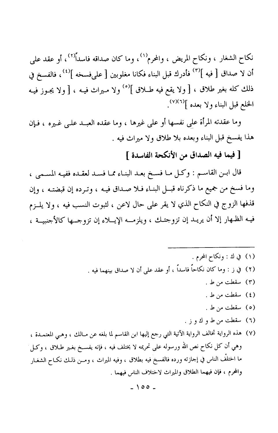 نكاح الشغار، ونكاح المريض، والمحرم، وما كان صداقه فاسداً، أو عقد على أن لا صداق [فيه] فأدرك قبل البناء فكانا مغلوبين [على فسخه] ، فالفسخ في ذلك كله بغير طلاق، [ولا يقع فيه طلاق] ولا ميراث فيه، [ولا يجوز فيه الخلع قبل البناء ولا بعده] .