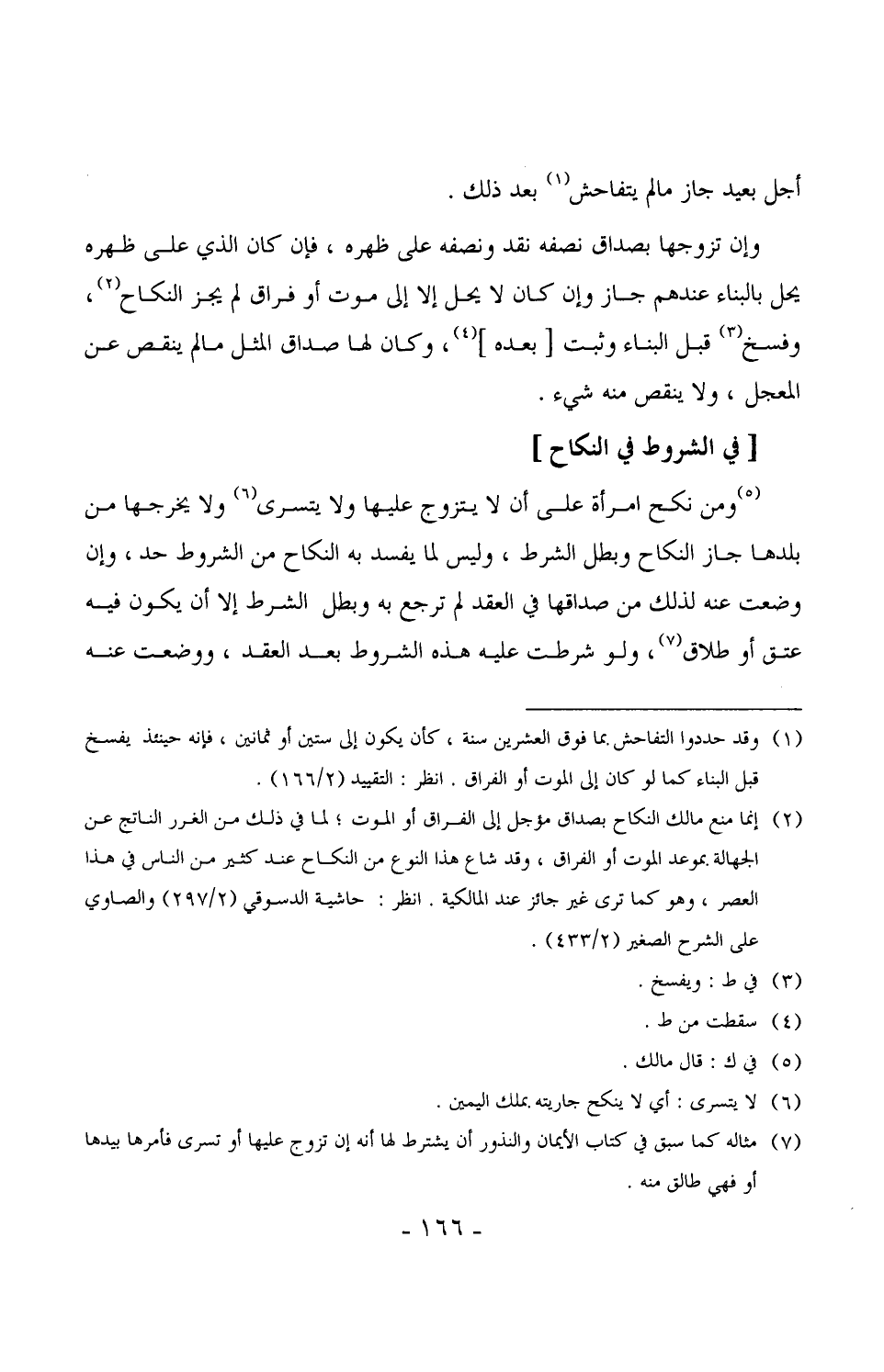 1374 - ومن نكح امرأة على أن لا يتزوج عليها ولا يتسرى ولا يخرجها من بلدها جاز النكاح وبطل الشرط، وليس لما يفسد به النكاح من الشروط حد، وإن وضعت عنه لذلك من صداقها في العقد لم ترجع به وبطل الشرط إلا أن يكون فيه عتق أو طلاق، ولو شرطت عليه هذه الشروط بعد العقد، ووضعت عنه
