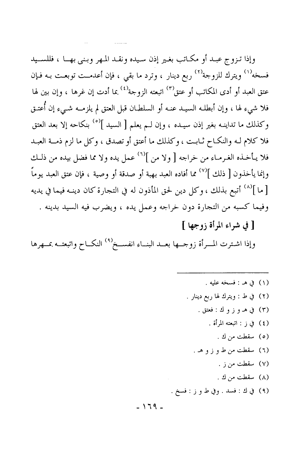 1378 - وإذا تزوج عبد أو مكاتب بغير إذن سيده ونقد المهر وبنى بها، فللسيد فسخه ويترك للزوجة ربع دينار، وترد ما بقي، فإن أعدمت توبعت به فإن عتق العبد أو أدى المكاتب أو عتق اتبعته الزوجة بما أدت إن غرها، وإن بين لها فلا شيء لها، وإن أبطله السيد عنه أو السلطان قبل العتق لم يلزمه شيء إن أُعتق وكذلك ما تداينه بغير إذن سيده، وإن لم يعلم [السيد] بنكاحه إلا بعد العتق فلا كلام له والنكاح ثابت، وكذلك ما أعتق أو تصدق، وكل ما لزم ذمة العبد فلا يأخذه الغرماء من خراجه [ولا من] عمل يده ولا مما فضل بيده من ذلك وإنما يأخذون [ذلك] مما أفاده العبد بهبة أو صدقة أو وصية، فإن عتق العبد يوماً بما] أتبع بذلك، وكل دين لحق المأذون له في التجارة كان دينه فيما في يديه وفيما كسبه من التجارة دون خراجه وعمل يده، ويضرب فيه السيد بدينه.