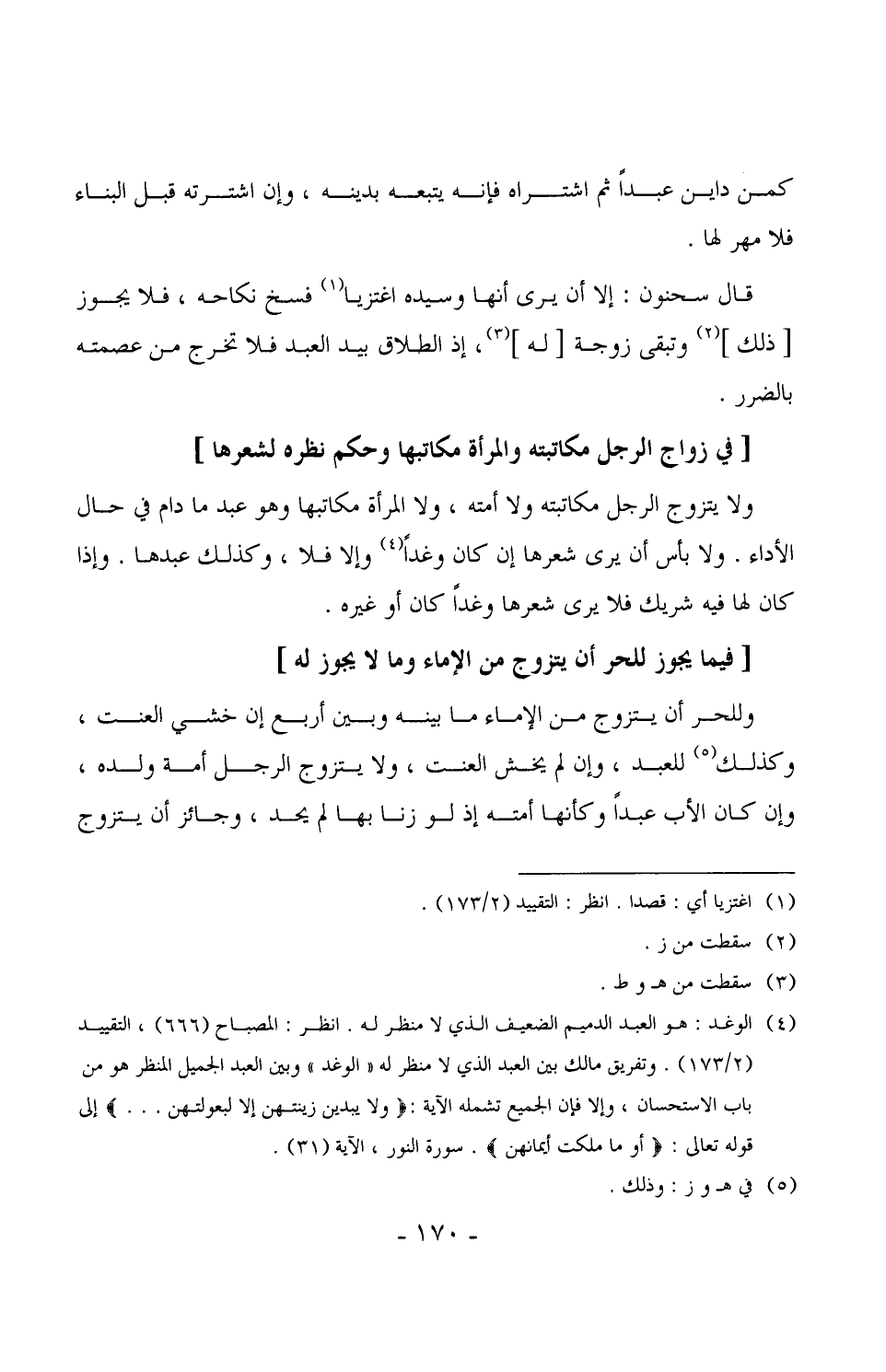 1380 - ولا يتزوج الرجل مكاتبته ولا أمته، ولا المرأة مكاتبها وهو عبد ما دام في حال الأداء. ولا بأس أن يرى شعرها إن كان وغداً وإلا فلا، وكذلك عبدها. وإذا كان لها فيه شريك فلا يرى شعرها وغداً كان أو غيره.