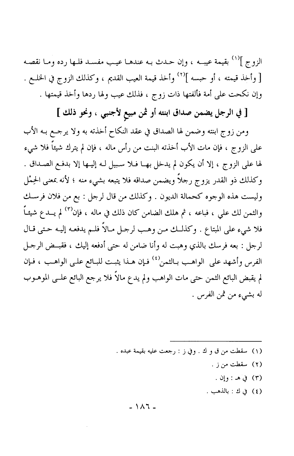 1401 - ومن زوج ابنته وضمن لها الصداق في عقد النكاح أخذته به ولا يرجع به الأب على الزوج، فإن مات الأب أخذته البنت من رأس ماله، فإن لم يترك شيئاً فلا شيء لها على الزوج، إلا أن يكون لم يدخل بها فلا سبيل له إليها إلا بدفع الصداق. وكذلك ذو القدر يزوج رجلاً ويضمن صداقه فلا يتبعه بشيء منه، لأنه بمعنى الحِمْل وليست هذه الوجوه كحمالة الديون. وكذلك من قال لرجل: بع من فلان فرسك والثمن لك علي، فباعه، ثم هلك الضامن كان ذلك في ماله، فإن لم يدع شيئاً فلا شيء على المبتاع. وكذلك من وهب لرجل مالاً فلم يدفعه إليه حتى قال لرجل: بعه فرسك بالذي وهبت له وأنا ضامن له حتى أدفعه إليك، فقبض الرجل الفرس وأشهد على الواهب بالثمن فإن هذا يثبت للبائع على الواهب، فإن لم يقبض البائع الثمن حتى مات الواهب ولم يدع مالاً فلا يرجع البائع على الموهوب له بشيء من ثمن الفرس.