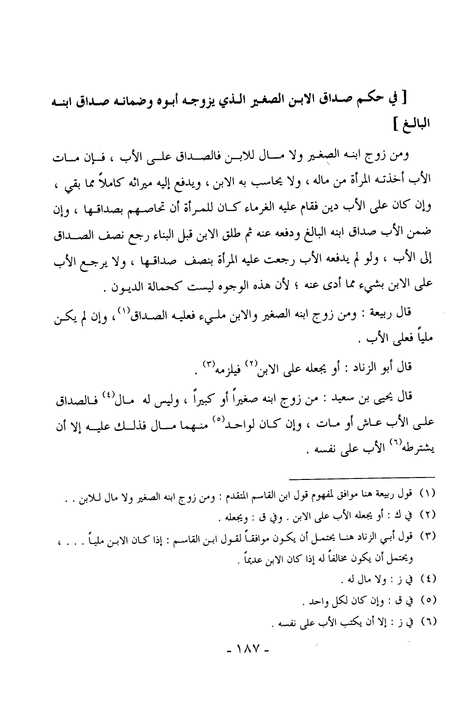 قال يحيى بن سعيد: من زوج ابنه صغيراً أو كبيراً، وليس له مال فالصداق على الأب عاش أو مات، وإن كان لواحد منهما مال فذلك عليه إلا أن يشترطه الأب على نفسه.