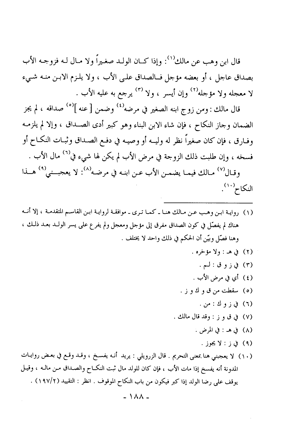 1403 - قال ابن وهب عن مالك: وإذا كان الولد صغيراً ولا مال له فزوجه الأب بصداق عاجل، أو بعضه مؤجل فالصداق على الأب، ولا يلزم الابن منه شيء لا معجله ولا مؤجله وإن أيسر، ولا يرجع به عليه الأب.