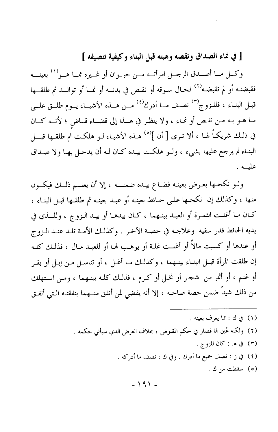1408 - ولو نكحها بعرض بعينه فضاع بيده ضمنه، إلا أن يعلم ذلك فيكون منها، وكذلك إن نكحها على حائط بعينه أو عبد بعينه ثم طلقها قبل البناء، كان ما أغلت الثمرة أو العبد بينهما، كان بيدها أو بيد الزوج، وللذي في يديه الحائط قدر سقيه وعلاجه في حصة الآخر. وكذلك الأمة تلد عند الزوج أو عندها أو كسبت مالاً أو أغلت غلة أو يوهب لها أو للعبد مال، فذلك كله إن طلقت المرأة قبل البناء بينهما، وكذلك ما أغل، أو تناسل من إبل أو بقر أو غنم، أو أثمر من شجر أو نخل أو كرم، فذلك كله بينهما، ومن استهلك من ذلك شيئاً ضمن حصة صاحبه، إلا أنه يقضي لمن أنفق منهما بنفقته التي أنفق