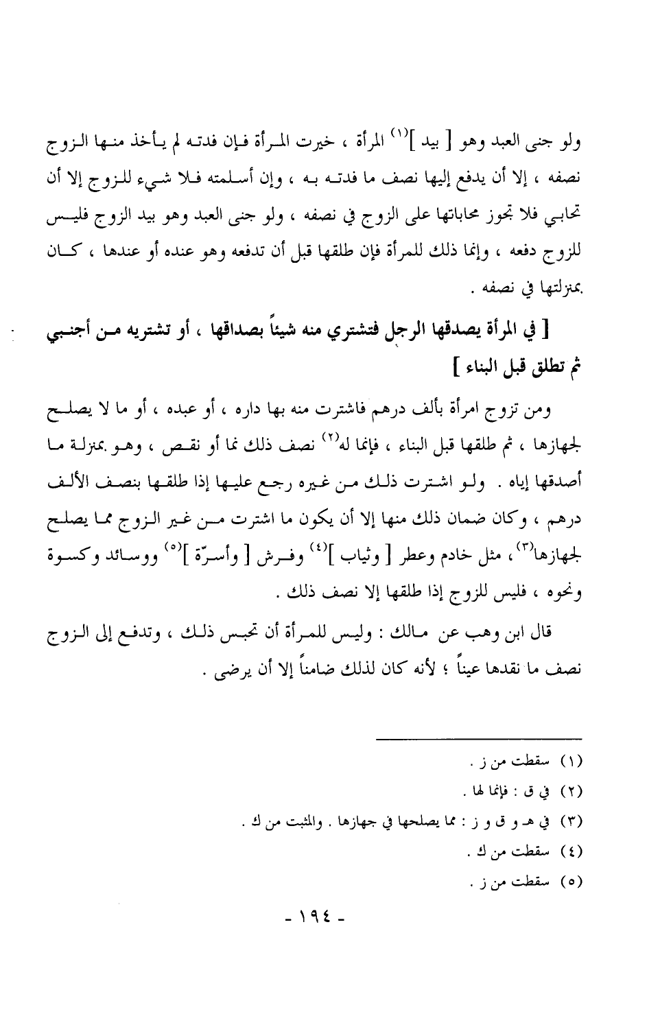 1412 - ومن تزوج امرأة بألف درهم فاشترت منه بها داره، أو عبده، أو ما لا يصلح لجهازها، ثم طلقها قبل البناء، فإنما له نصف ذلك نما أو نقص، وهو بمنزلة ما أصدقها إياه. ولو اشترت ذلك من غيره رجع عليها إذا طلقها بنصف الألف درهم، وكان ضمان ذلك منها إلا أن يكون ما اشترت من غير الزوج مما يصلح لجهازها، مثل خادم وعطر [وثياب] وفرش [وأسرّة] ووسائد وكسوة ونحوه، فليس للزوج إذا طلقها إلا نصف ذلك.