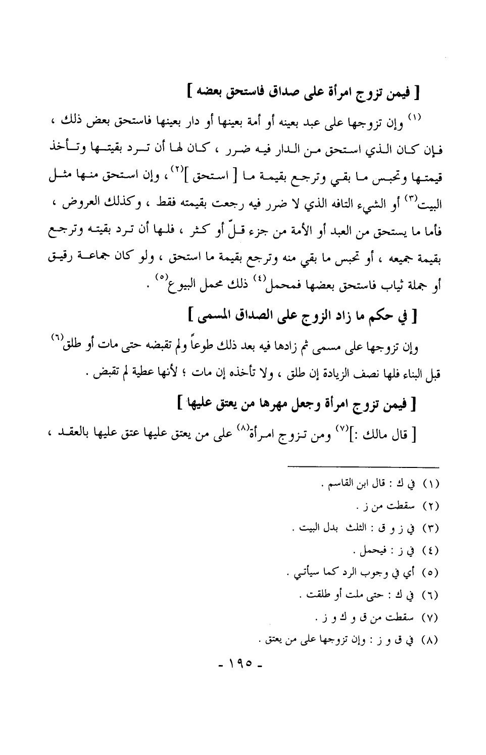 1414 - وإن تزوجها على عبد بعينه أو أمة بعينها أو دار بعينها فاستحق بعض ذلك، فإن كان الذي استحق من الدار فيه ضرر، كان لها أن ترد بقيتها وتأخذ قيمتها وتحبس ما بقي وترجع بقيمة ما [استحق] ، وإن استحق منها مثل البيت أو الشيء التافه الذي لا ضرر فيه رجعت بقيمته فقط، وكذلك العروض، فأما ما يستحق من العبد أو الأمة من جزء قلّ أو كثر، فلها أن ترد بقيته وترجع بقيمة جميعه، أو تحبس ما بقي منه وترجع بقيمة ما استحق، ولو كان جماعة رقيق أو جملة ثياب فاستحق بعضها فمحمل ذلك محمل البيوع.