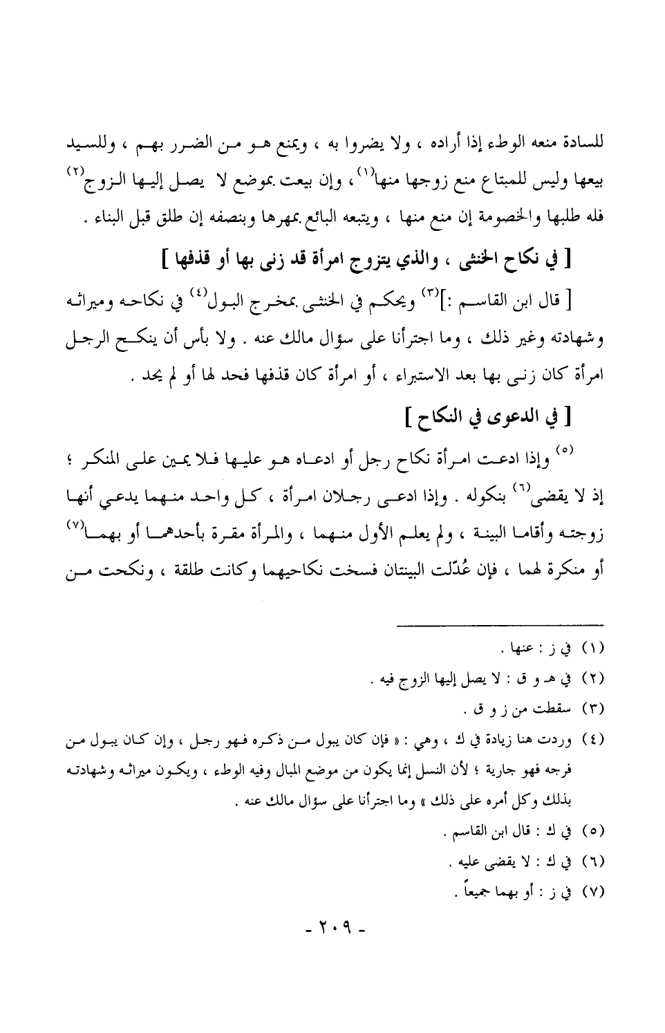 1443 -[قال ابن القاسم:] ويحكم في الخنثى بمخرج البول في نكاحه وميراثه وشهادته وغير ذلك، وما اجترأنا على سؤال مالك عنه. ولا بأس أن ينكح الرجل امرأة كان زنى بها بعد الاستبراء، أو امرأة كان قذفها فحد لها أو لم يحد. (¬1)