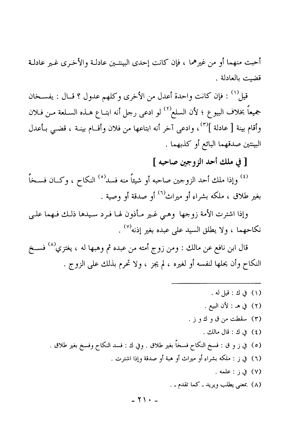 1445 - وإذا ملك أحد الزوجين صاحبه أو شيئاً منه فسد النكاح، وكان فسخاً بغير طلاق، ملكه بشراء أو ميراث أو صدقة أو وصية.