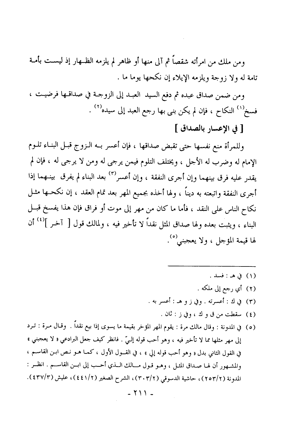 1447 - ومن ضمن صداق عبده ثم دفع السيد العبد إلى الزوجة في صداقها فرضيت، فسخ النكاح، فإن لم يكن بنى بها رجع العبد إلى سيده.