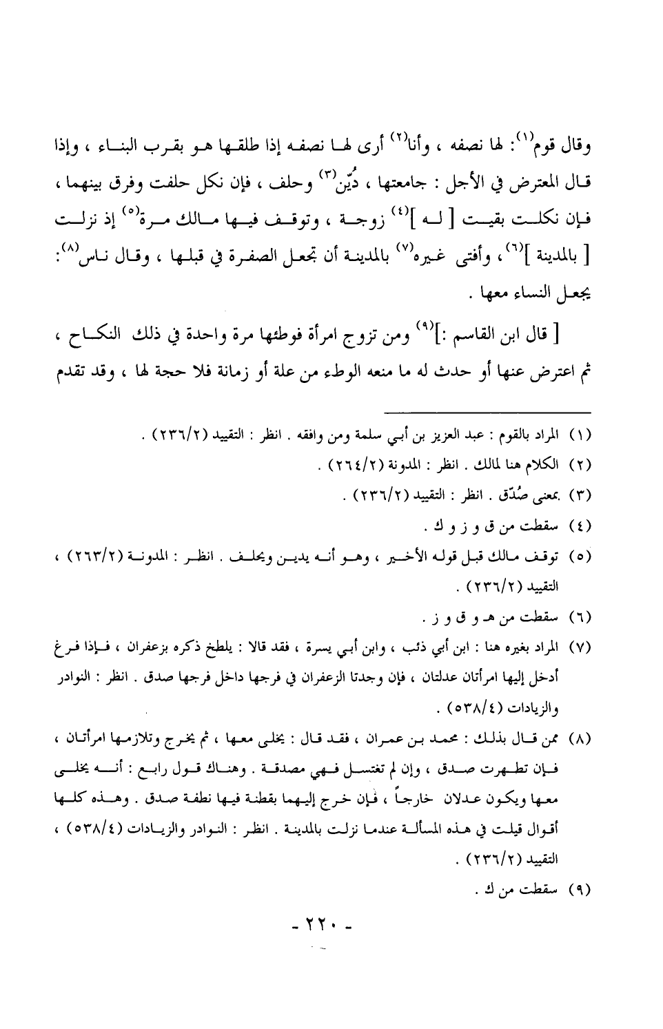 وقال قوم: لها نصفه، وأنا أرى لها نصفه إذا طلقها هو بقرب البناء، وإذا قال المعترض في الأجل: جامعتها، دُيّن وحلف، فإن نكل حلفت وفرق بينهما، فإن نكلت بقيت [له] زوجة، وتوقف فيها مالك مرة إذ نزلت [بالمدينة] ، وأفتى غيره بالمدينة أن تجعل الصفرة في قبلها، وقال ناس: يجعل النساء معها.