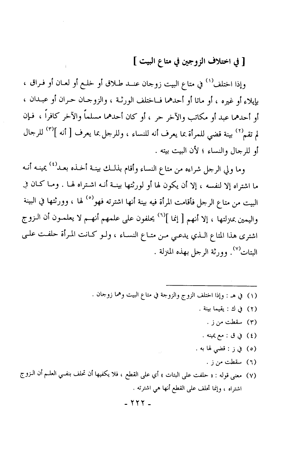 1468 - وإذا اختلف في متاع البيت زوجان عند طلاق أو خلع أو لعان أو فراق، بإيلاء أو غيره، أو ماتا أو أحدهما فاختلف الورثة، والزوجان حران أو عبدان، أو أحدهما عبد أو مكاتب والآخر حر، أو كان أحدهما مسلماً والآخر كافراً، فإن لم تقم بينة قضي للمرأة بما يعرف أنه للنساء، وللرجل بما يعرف [أنه] للرجال أو للرجال والنساء، لأن البيت بيته.